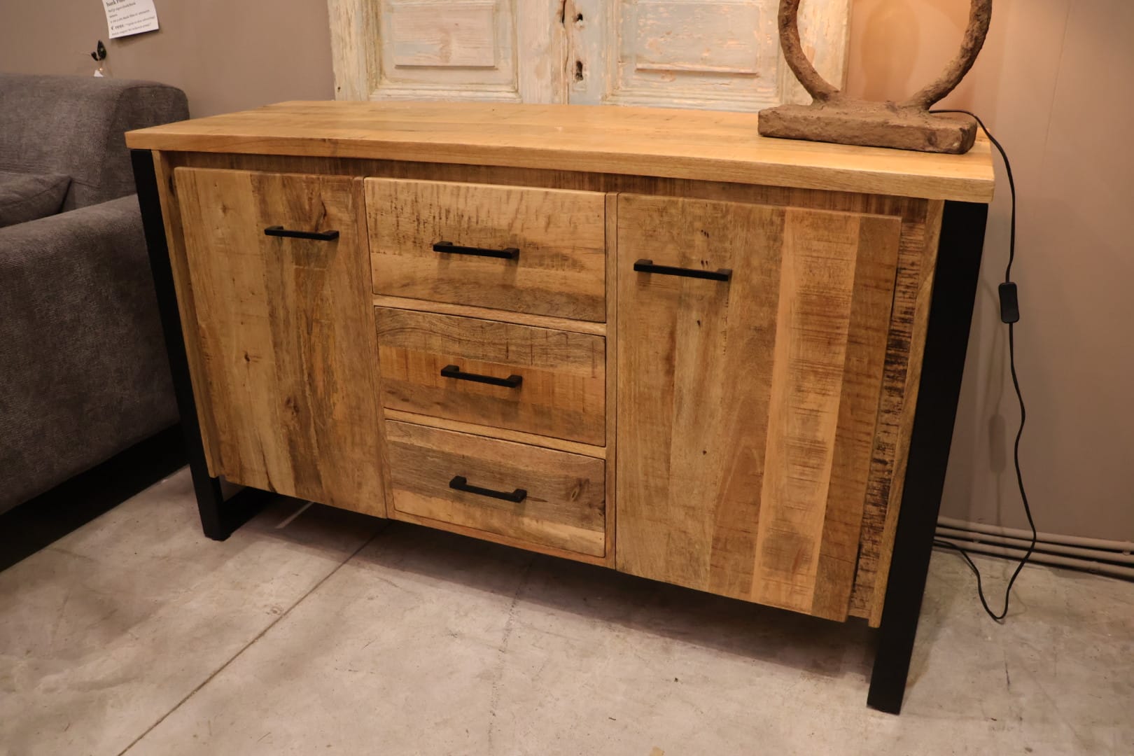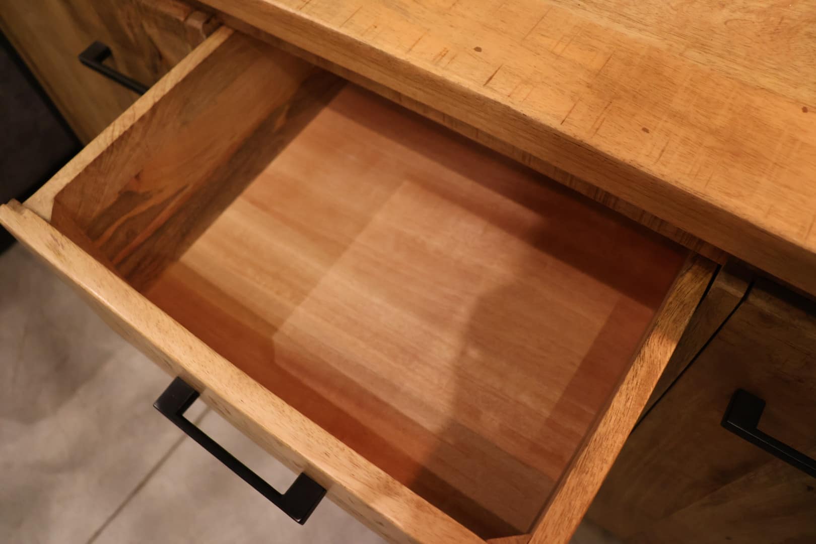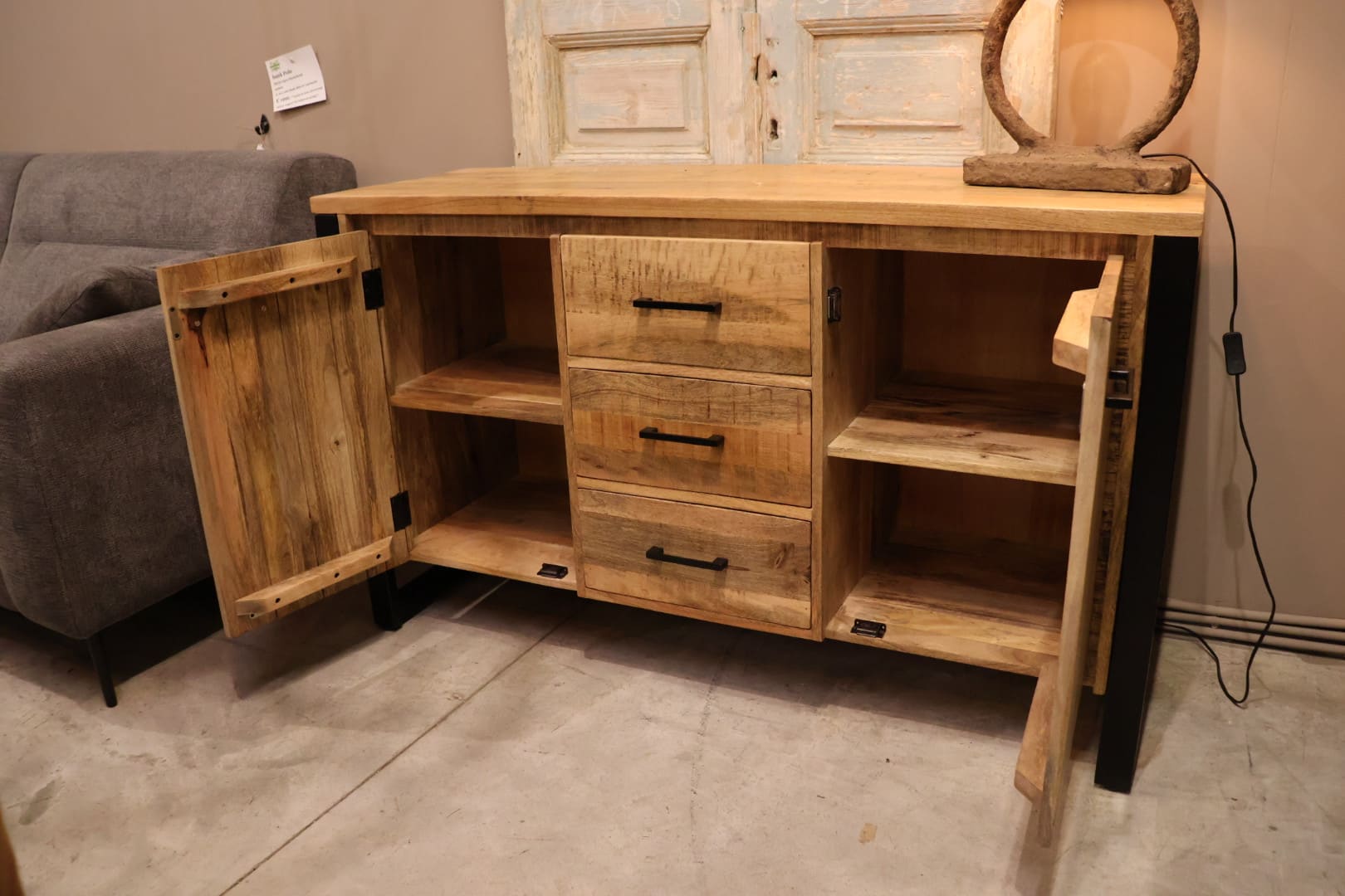 Dit compacte dressoir van mangohout is de ideale oplossing voor wie stijl en functionaliteit wil combineren in een kleien ruimte. Dankzij het slimme ontwerp met deurtjes en lades biedt het meubel verrassend veel opbergruimte.
