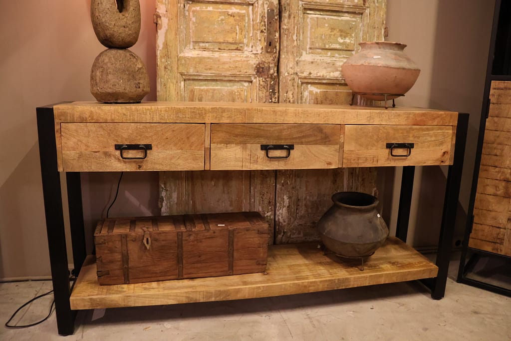 Dit compacte dressoir van mangohout is de ideale oplossing voor wie stijl en functionaliteit wil combineren in een kleien ruimte. Dankzij het slimme ontwerp met deurtjes en lades biedt het meubel verrassend veel opbergruimte.