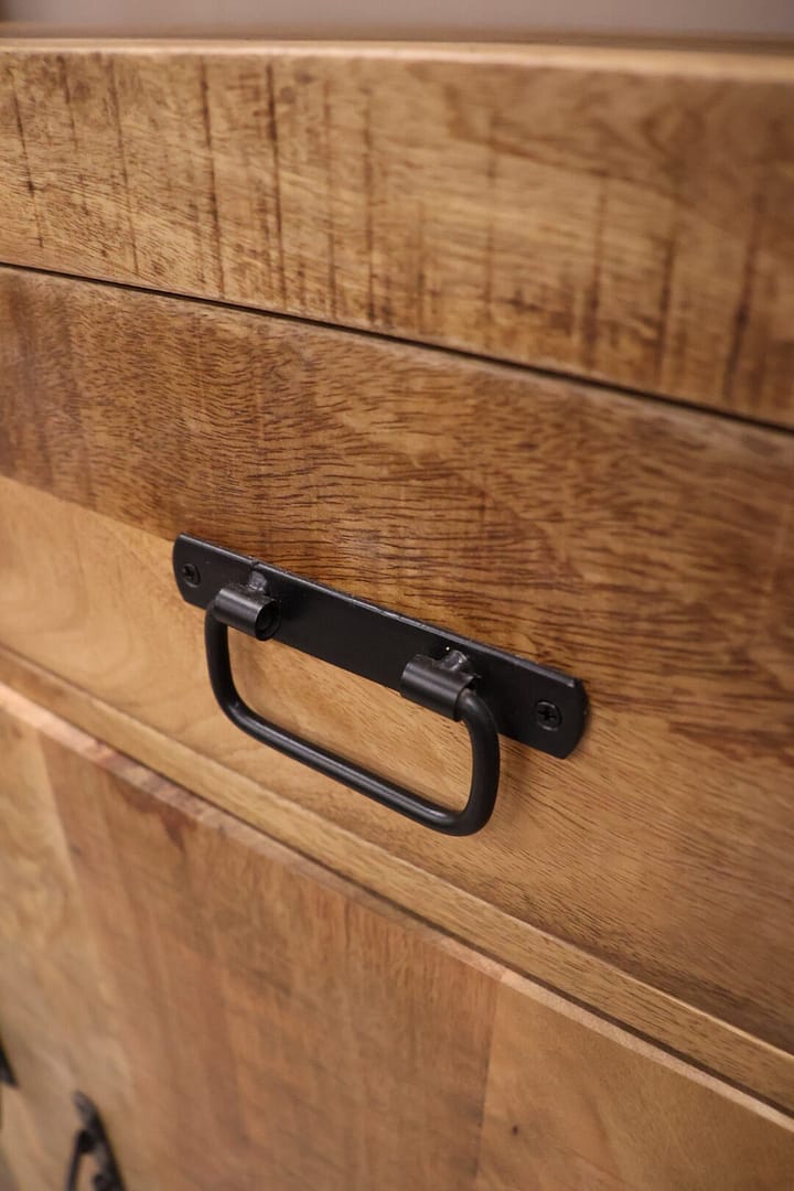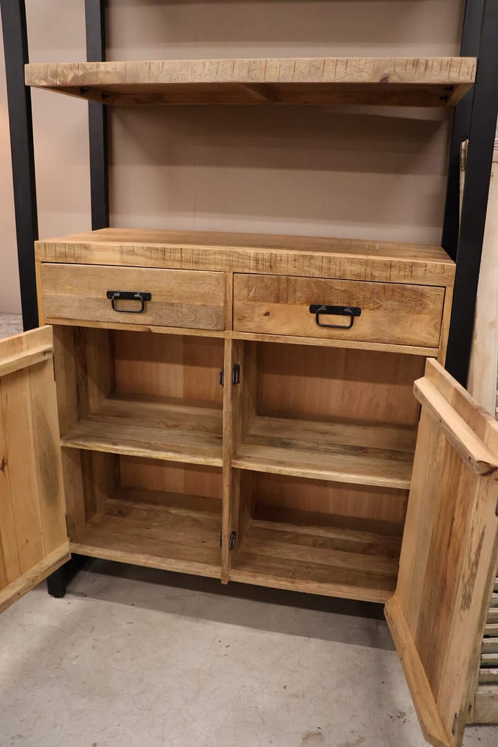 Deze boekenkast van mangohout combineert een stoere, warme uitstraling met praktische opbergruimte. onderop bevinden zich deurtjes voor het netjes opbergen van spullen, terwijl bovenop een open planken ideaal is om je mooiste accessoires, boeken of decoratie tentoon te stellen.