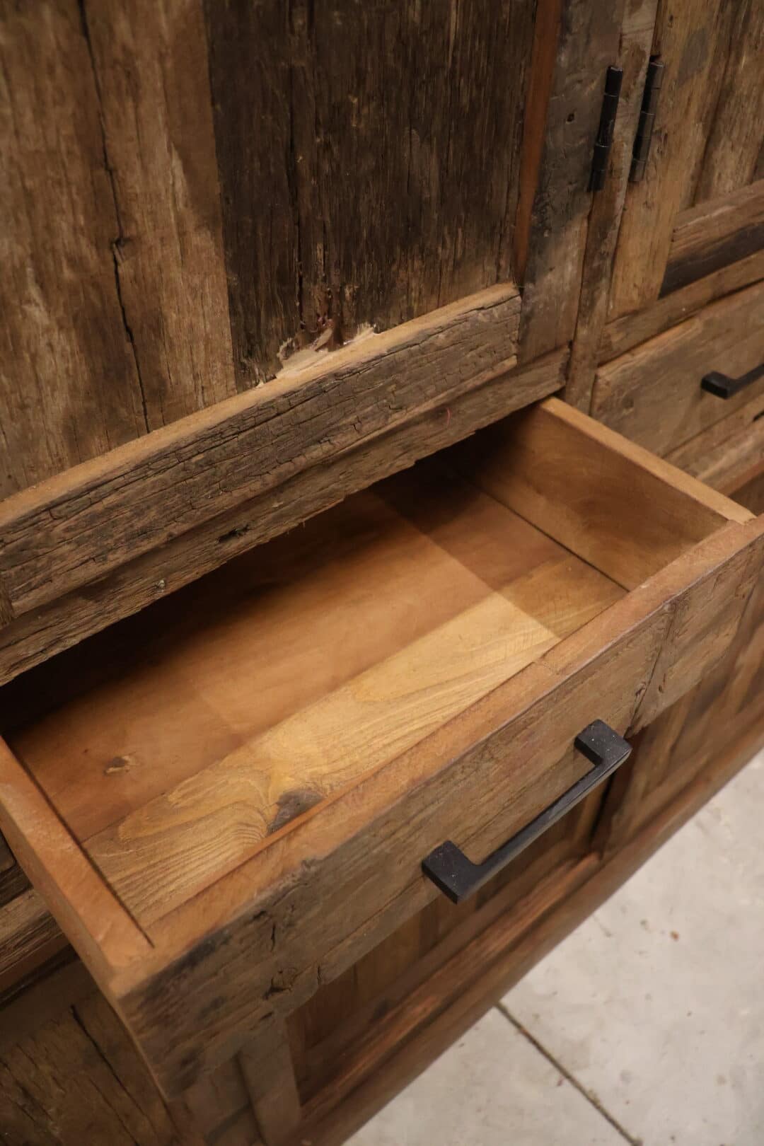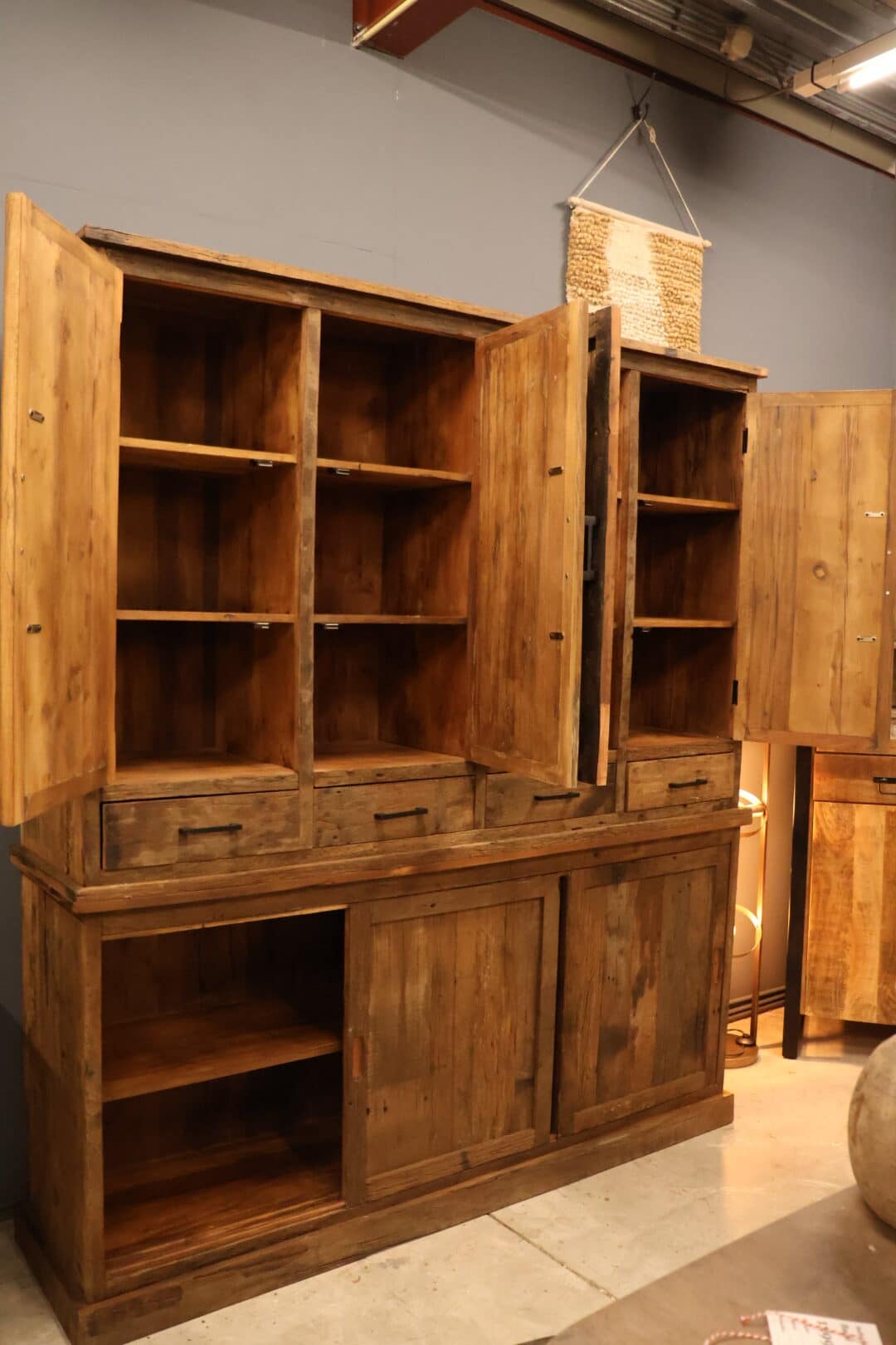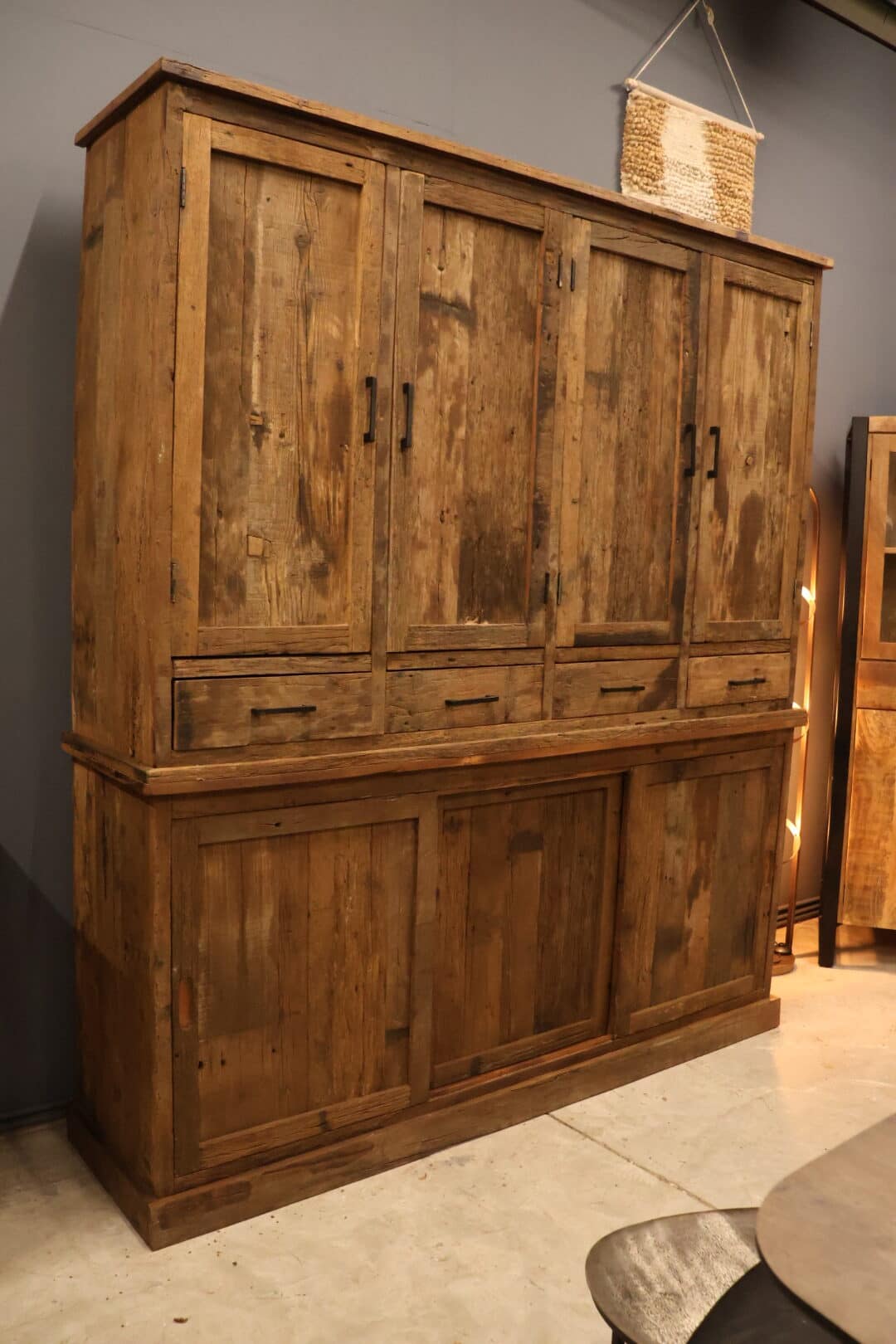 Deze buffetkast van sleeperwood is een echte blikvanger in huis. Het robuuste materiaal en de karaktervolle houtstructuur geven de kast een stoere en warme uitstraling. Dankzij de ruime opbergruimte is er volop plek voor servies, accessoires en andere spullen. Een functioneel meubel met karakter dat past in zowel moderne als landelijke interieurs.