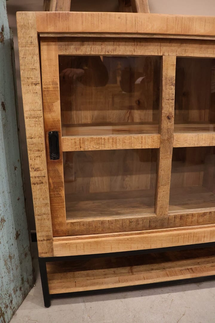 Deze dressoir vitrinekast van mangohout is het perfecte meubel om je unieke spulletjes in op te bergen en tentoon te stellen. Dankzij het smalle formaat past de kast gemakkelijke in kleinere ruimtes, terwijl het warme hout en de elegante afwerking zorgen voor een stijlvolle uitstraling