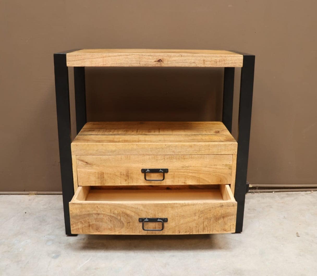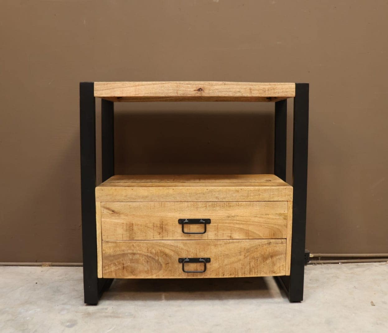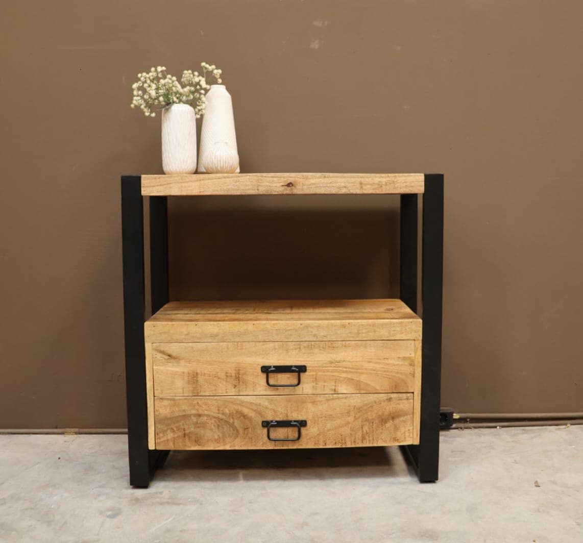 Dit leuke handige mangohouten kastje met 2 lades en een legplank boven is een handige opberger. Ook naast bed zal hij niet misstaan.