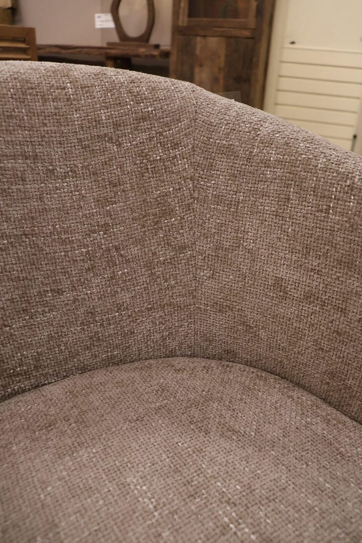 De fauteuil is bekleed met een hoogwaardige stof in een warme zandtint, die rust en verfijning uitstraalt. De comfortabele zit en stevige rugleuning zorgen ervoor dat je heerlijk kunt ontspannen, of je nu een boek leest, tv kijkt of geniet van een kop koffie.