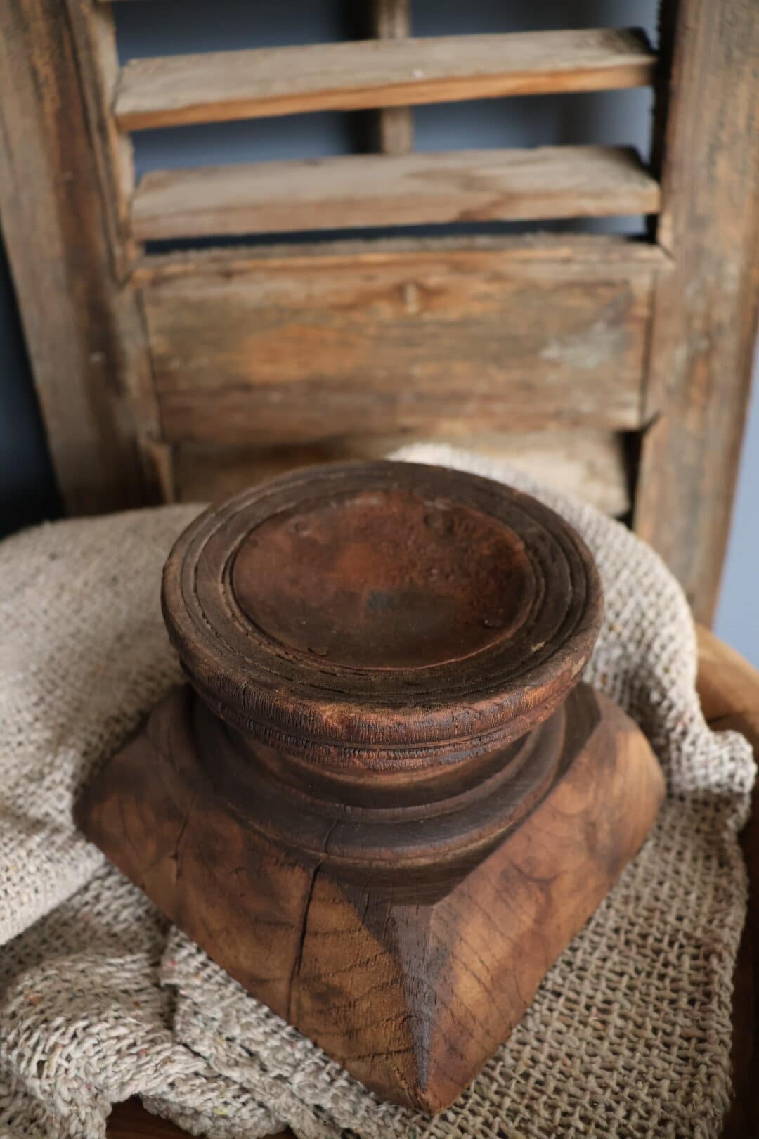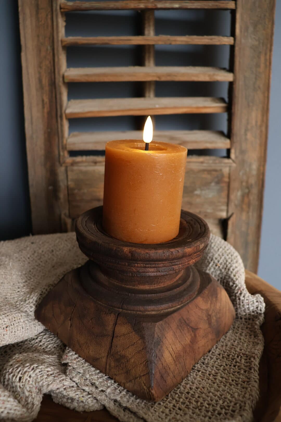 Ronde kandelaar van hout met fraai en gedetailleerd snijwerk. Het subtiele patroon geeft een sfeervol effect wanneer er een kaars in wordt geplaats. Een decoratief en warm accent voor op tafel, plank of vensterbank.