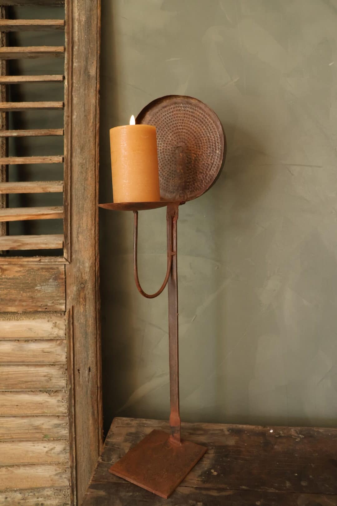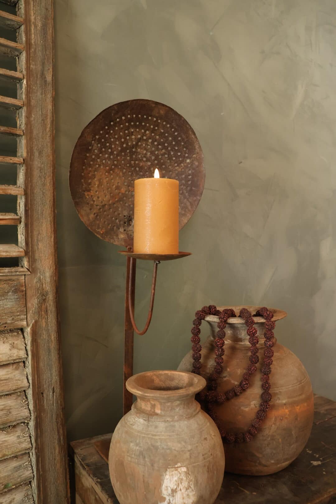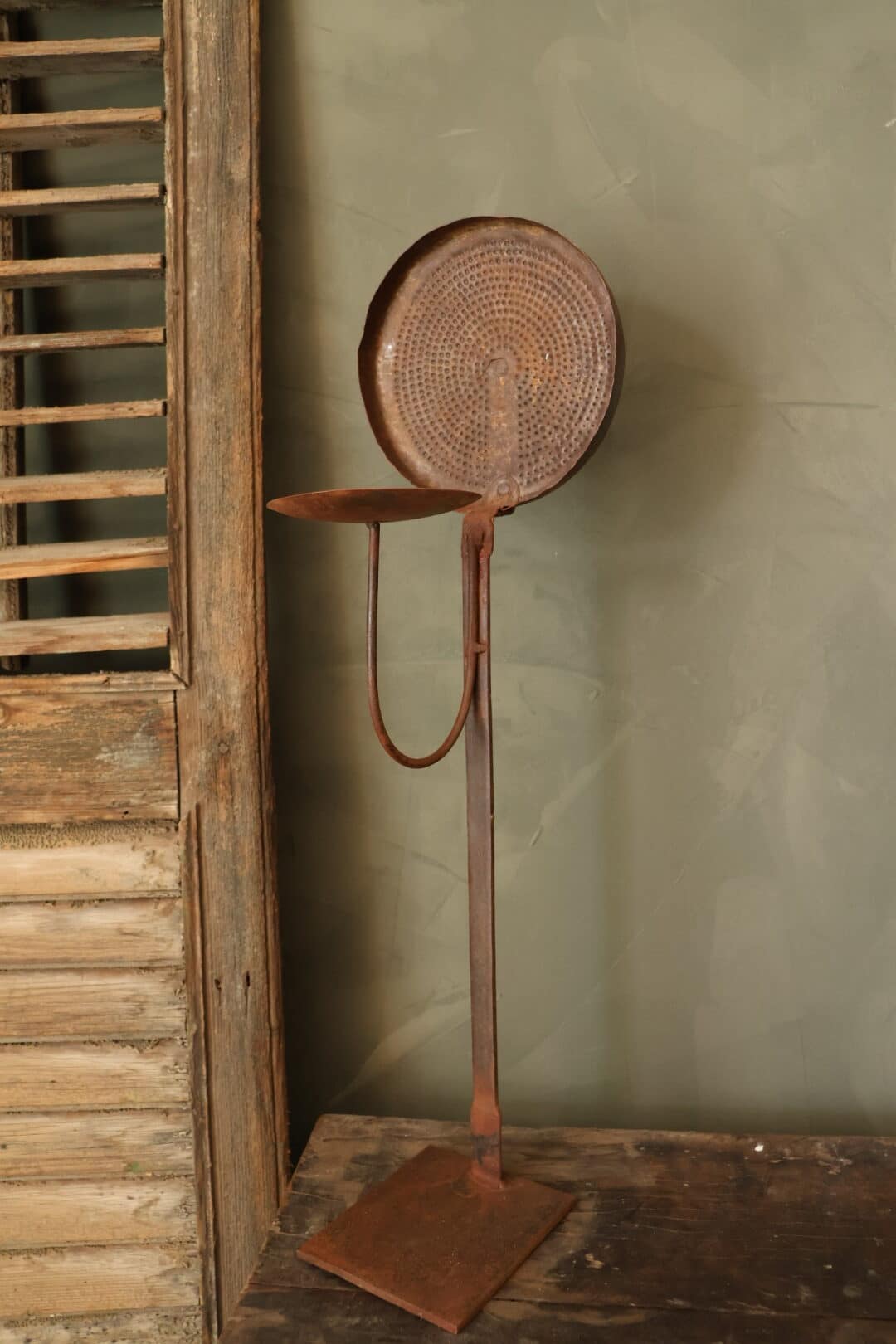 Kandelaar gemaakt van een grote oude metalen schuimspaan.