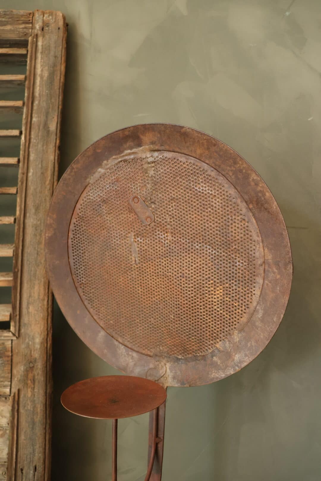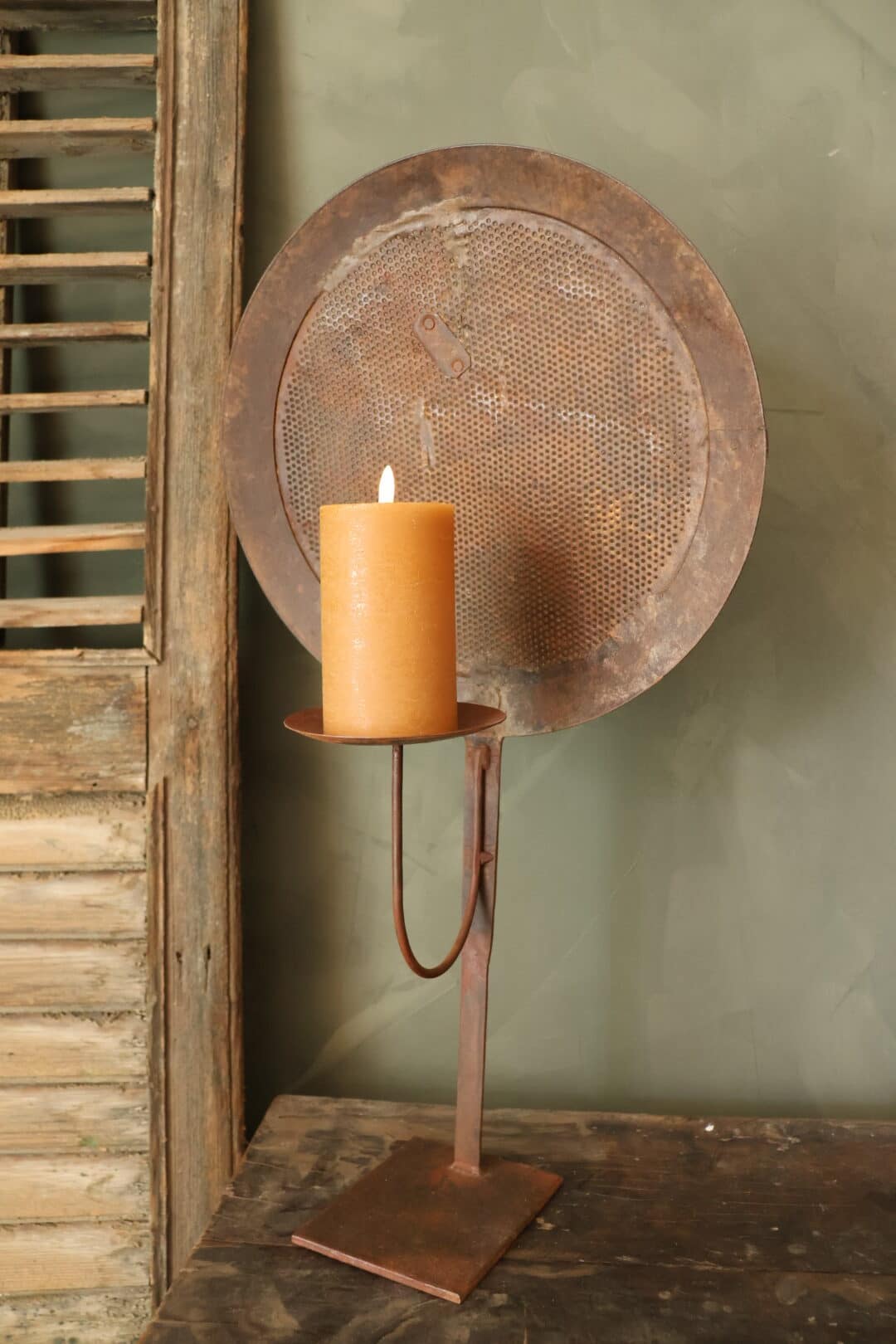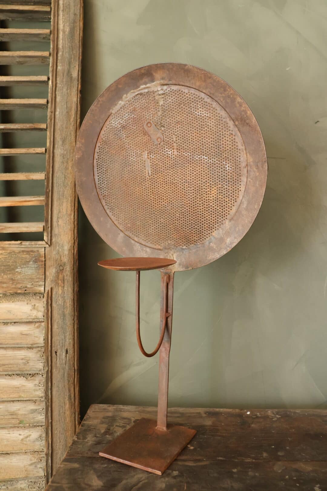 Kandelaar gemaakt van een grote oude metalen schuimspaan.