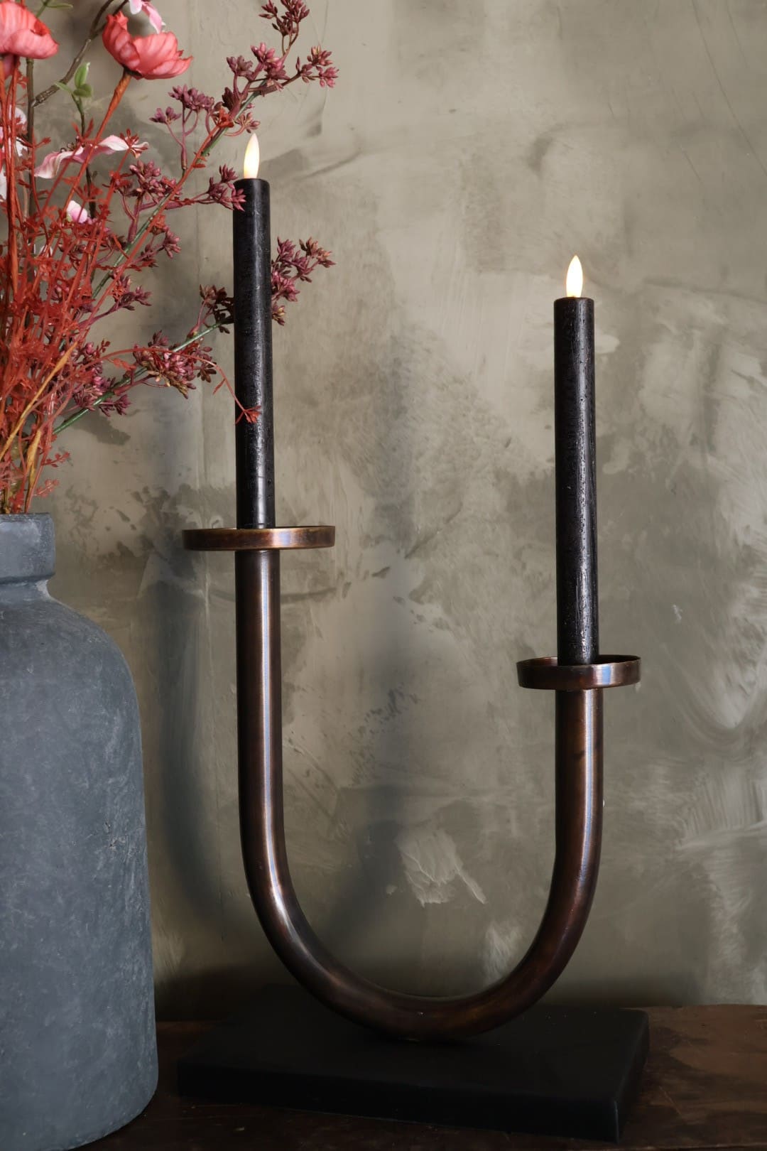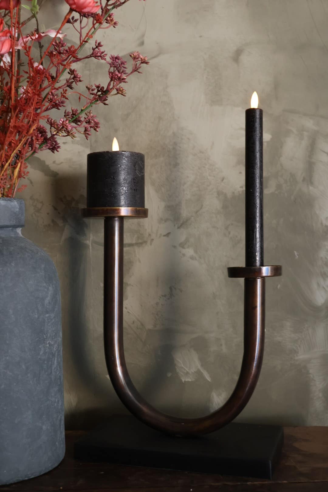 Metalen kandelaar met plek voor 2 kaarsen. Je kan er 2 dinerkaarsen in zetten maar de combinatie van een dinerkaars met een stompkaars met hem net iets speelser.