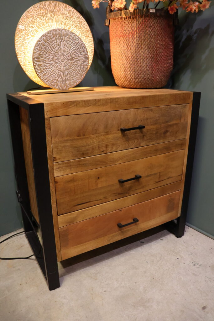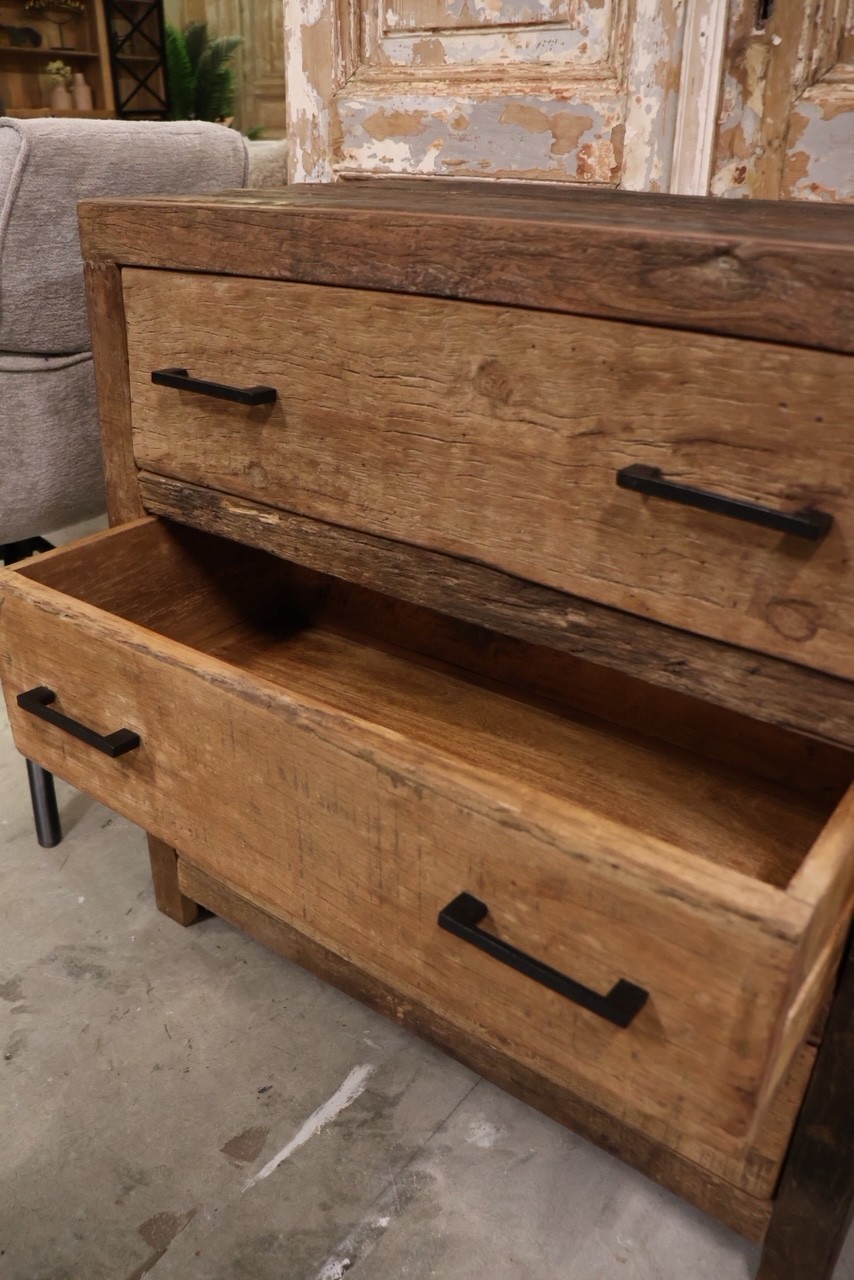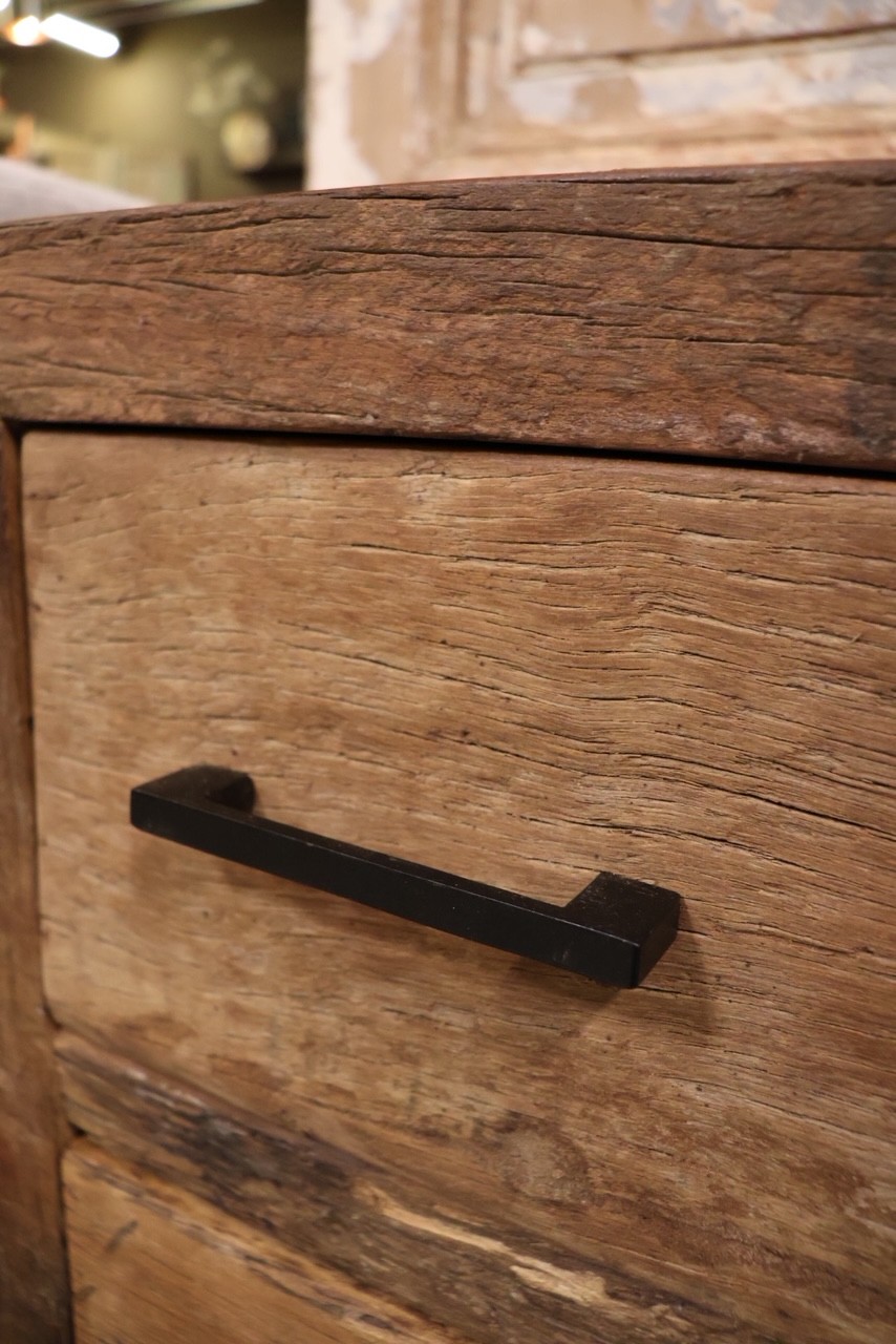 Deze stoere ladenkast is gemaakt van prachtig doorleefd oud hout. Wat het stuk voor stuk unieke exemplaren maakt. Je heb ruimte om je woonaccessoires neer te zetten maar er is ook genoeg opbergruimte.
