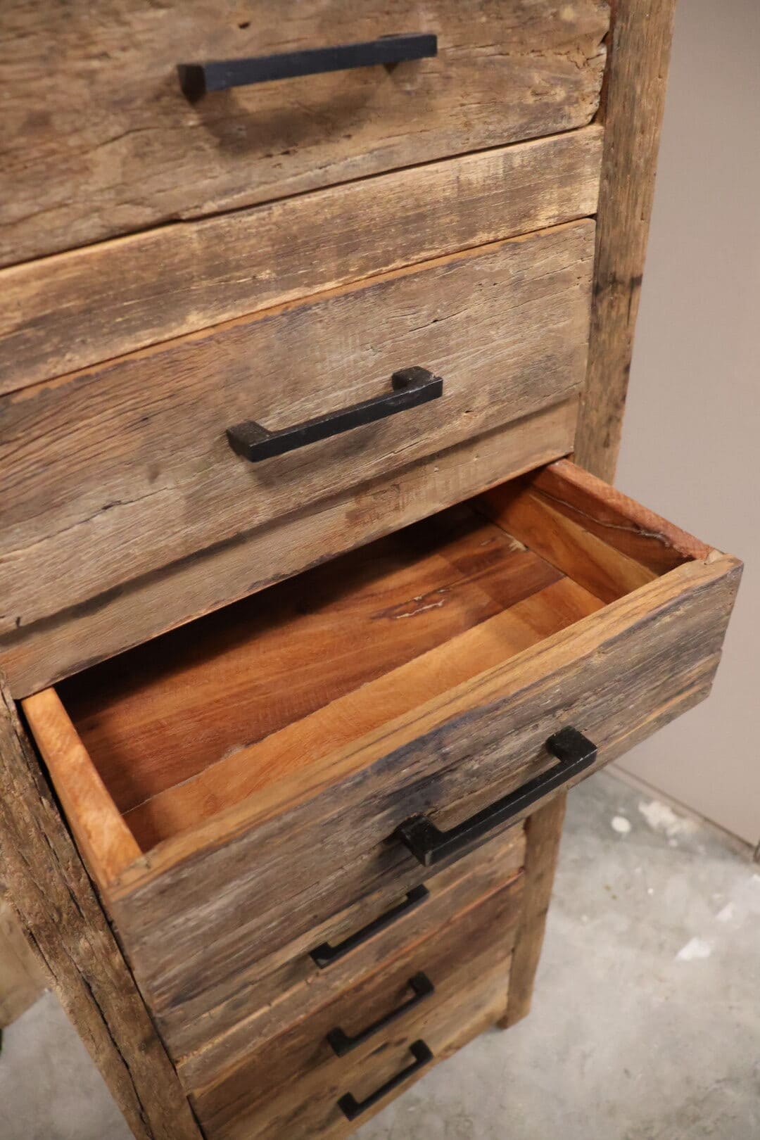 De sleeper wood ladenkast is de perfecte mix van stoer design en praktisch gebruiksgemak. Deze smalle, hoge kast neemt weinig ruimte in, maar biedt verrassend veel opbergmogelijkheden.