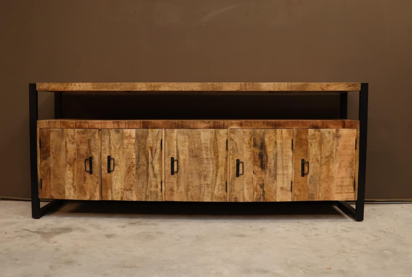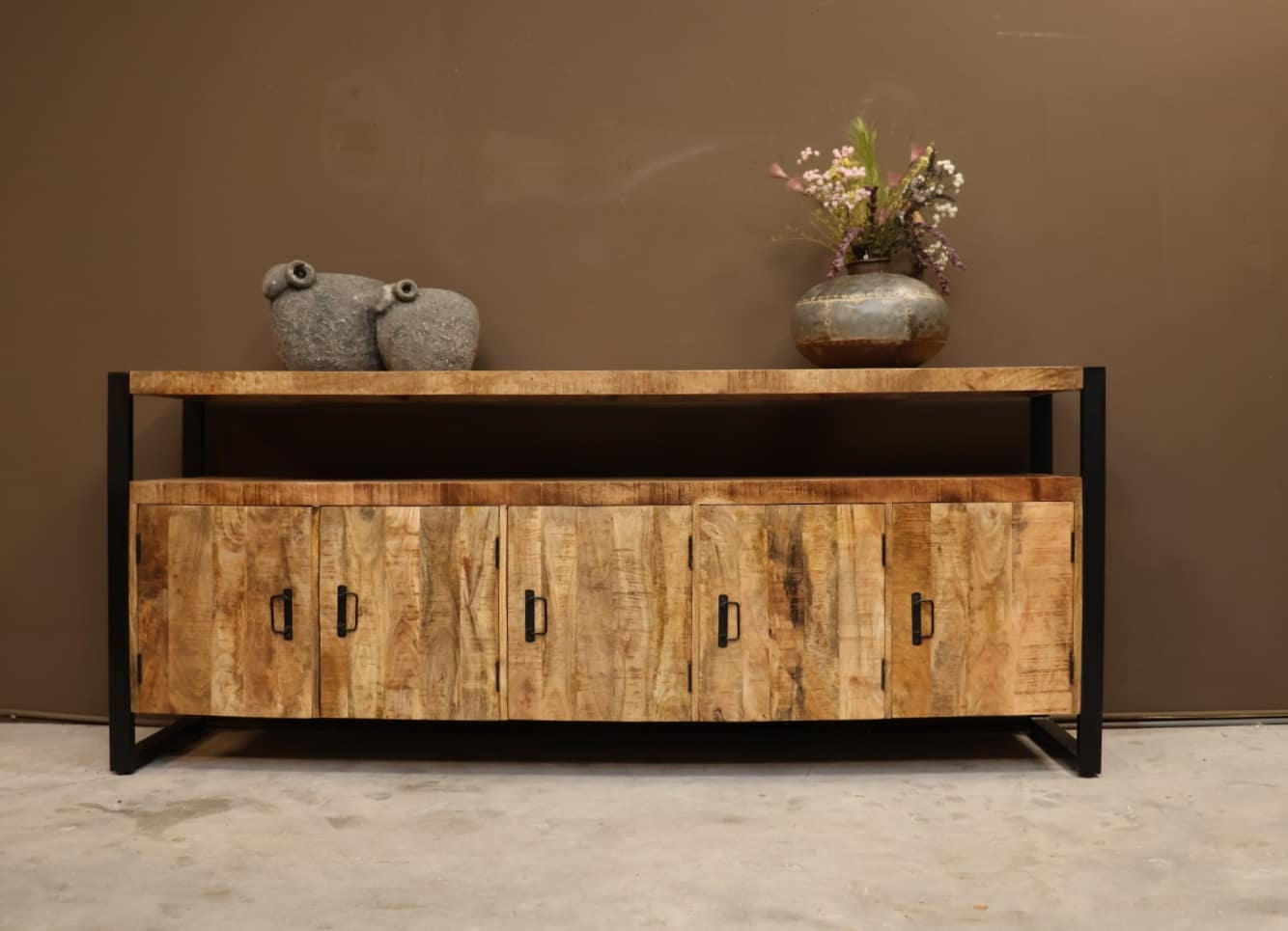 Dressoir Evelien is uitgevoerd in een combinatie van mangohout en wart metaal. Het dressoir past in meerdere woonstijlen, stoer industrieel en landelijk, maar past ook prima in een eclectisch of modern interieur.