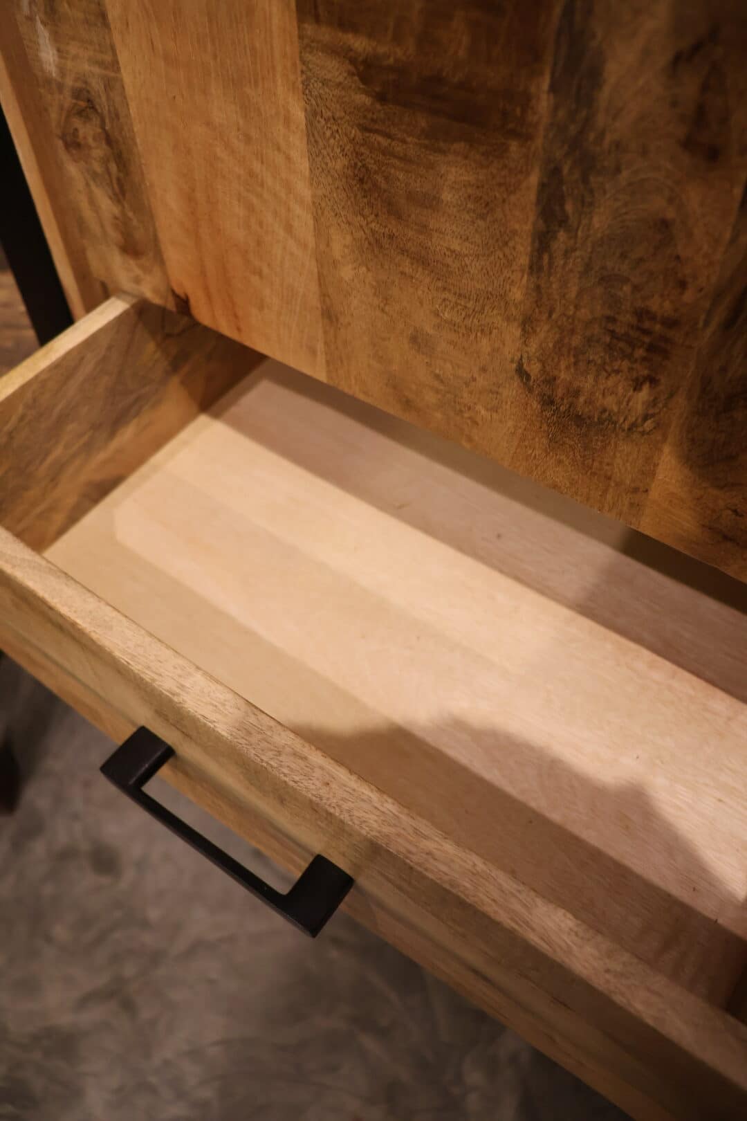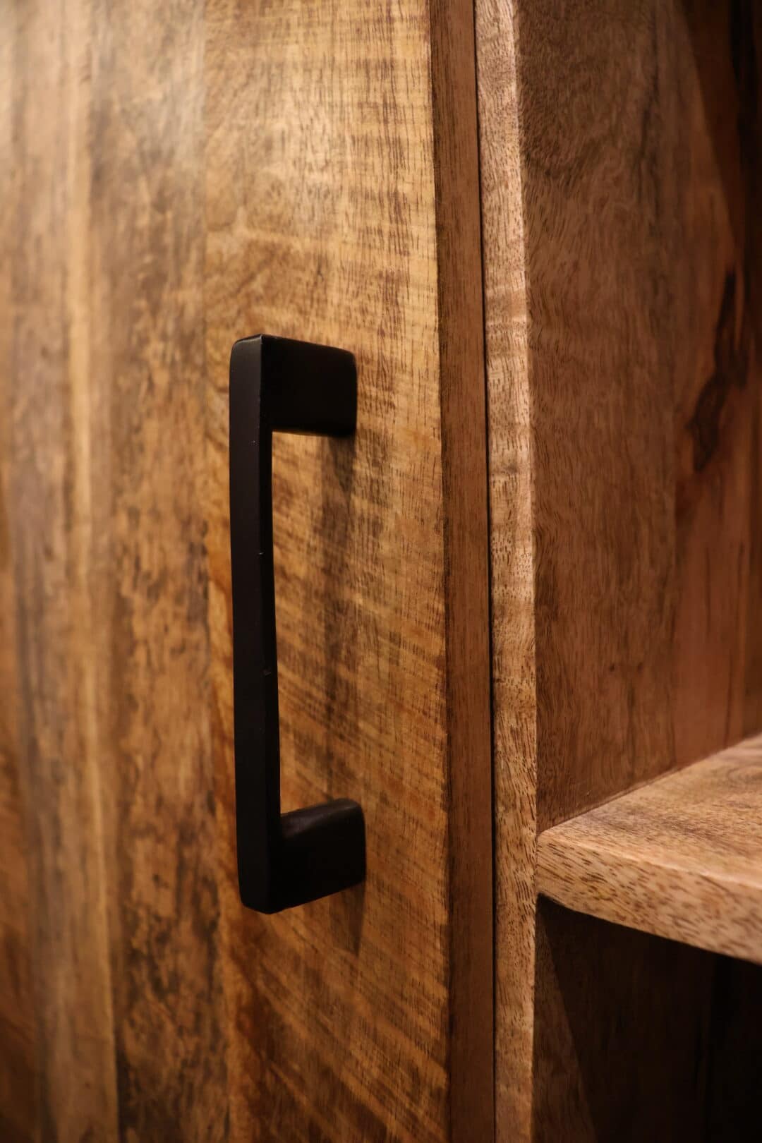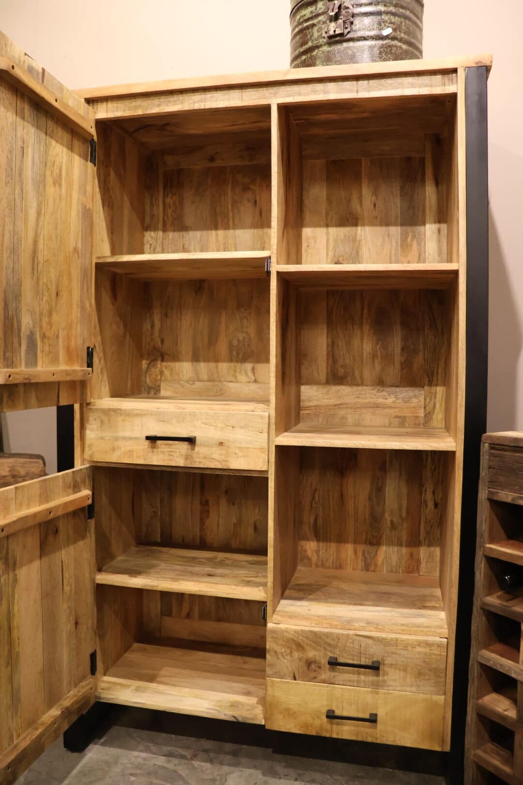 Deze stijlvolle opbergkast van mangohouten is de perfecte combinatie van functionaliteit en uitstraling. Dankzij de praktische indeling met deurtjes, lades en open vakken biedt de kast volop ruimte om je spullen netjes op te bergen en je mooiste accessoires te presenteren.