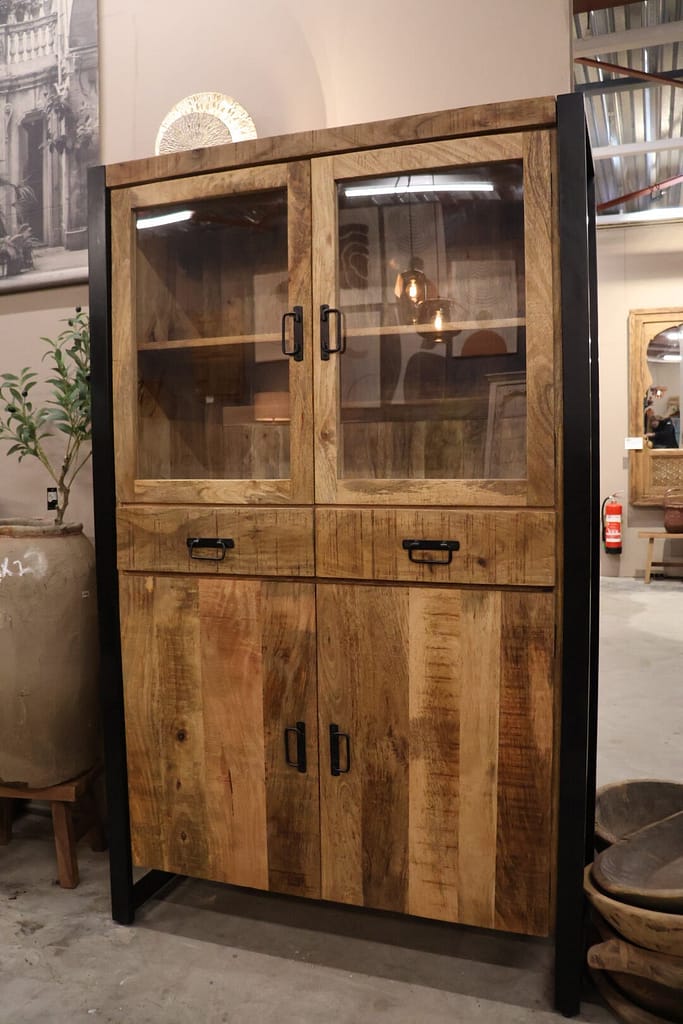 Vitrinekast Stefano is een lekker hoge kast met een originele indeling. De kast heeft onder 4 lades en een grote dichte deur waarachter je veel handige opbergruimte hebt. Bovenin blijft er een mooie ruimte over achter de glazen deur met 2 brede legplanken. Rechts van de deur heeft de kast nog 2 wat smallere legplanken, wat de kast vrij bijzonder maakt.