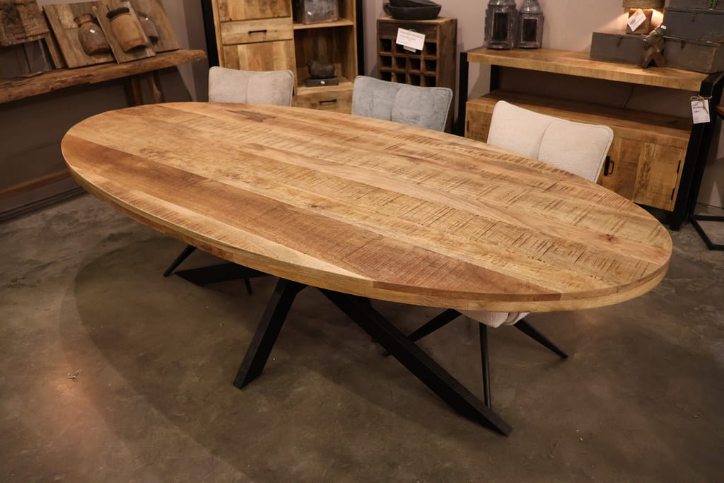 Prachtige mangohouten eetkamertafel met een boomstamblad. De tafel heeft een handig matrix onderstel.