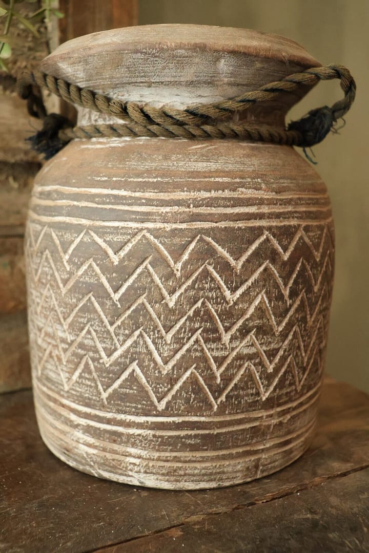 Deze unieke oude kruik van hout heeft een sierlijke kraag en een sierlijk patroon.