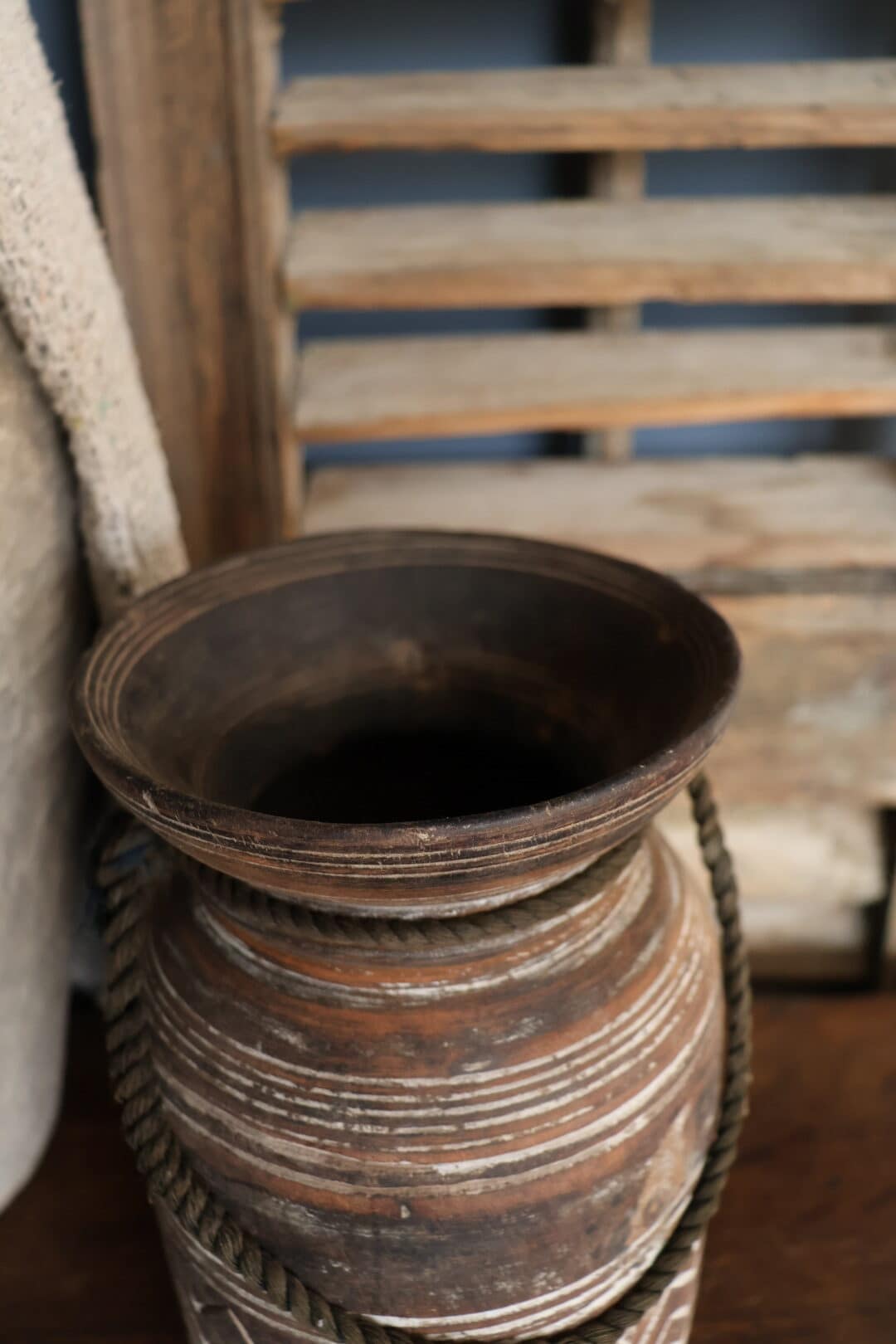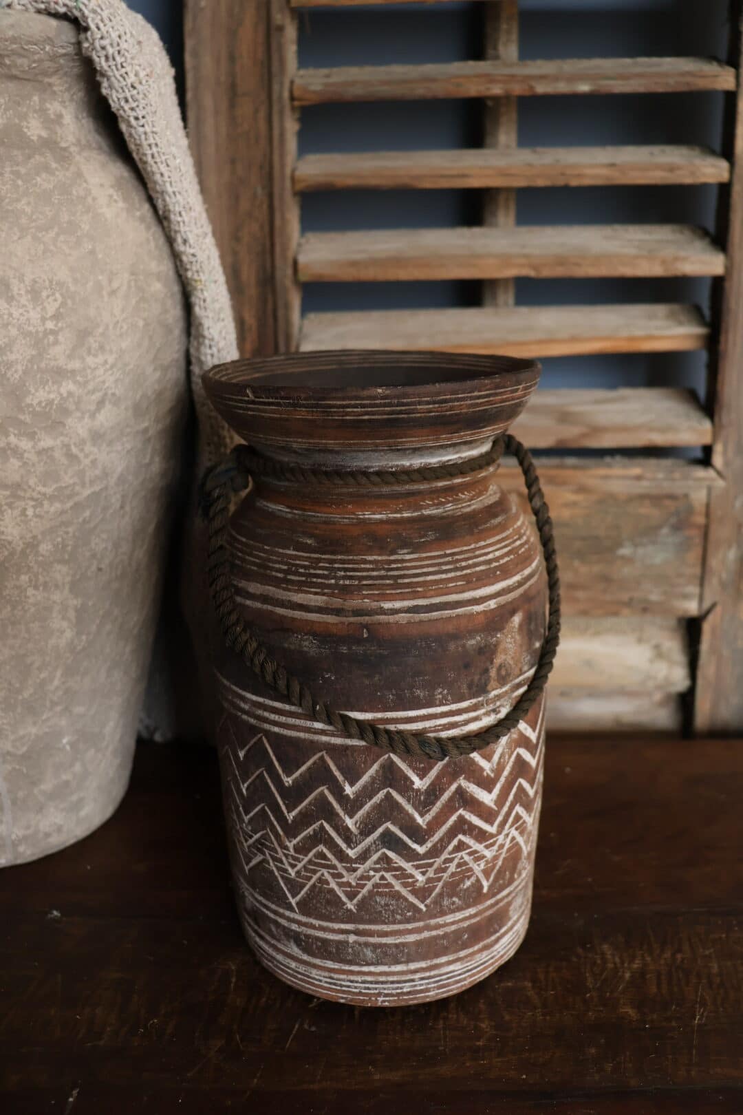 Houten Nepalese vaas met prachtig handgesneden snijwerk en een warme, natuurlijke uitstraling. Afkomstig uit India en stuk voor stuk verschillende door het handwerk en het hout. Mooi als decoratie op een kast, tafel of vensterbank, zowel met takken of zijdebloemen als puur als decoratief object. Een bijzondere toevoeging aan elk interieur.
