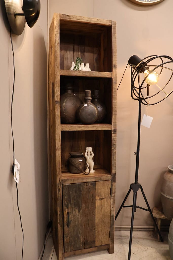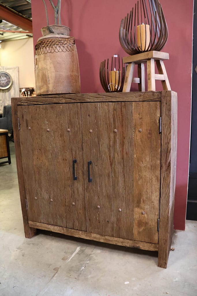 Gemaakt van hoogwaardig sleepwood hout straalt deze kast pure robuustheid uit. De unieke indeling met verschillende vakken en deuren zorgt voor een speels en functioneel geheel. Of je nu servies, boeken of woonaccessoires wilt opbergen – deze kast biedt ruimte en karakter. De natuurlijke houttinten en ruwe afwerking geven het meubel een warme, stoere uitstraling die in elk interieur tot zijn recht komt.