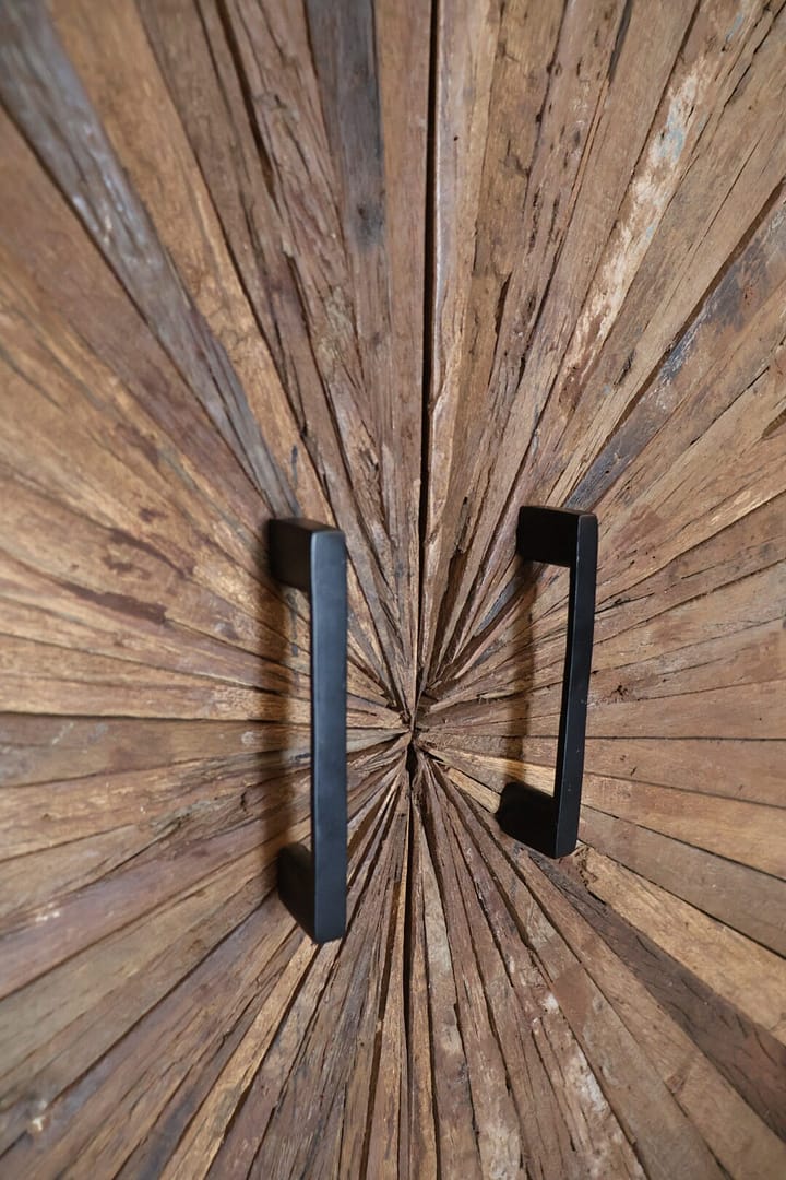Deze smalle, hoge opbergkast van sleepwood is een stoer meubelstuk dat weinig ruimte inneemt maar veel karakter toevoegt. Het unieke snijwerk in het duertje maakt de kast bijzonder, terwijl het robuuste hout zorgt voor een stoere en doorleefde uitstraling.