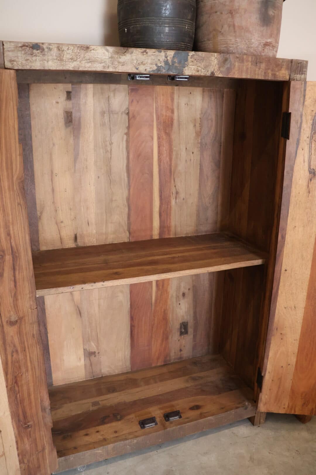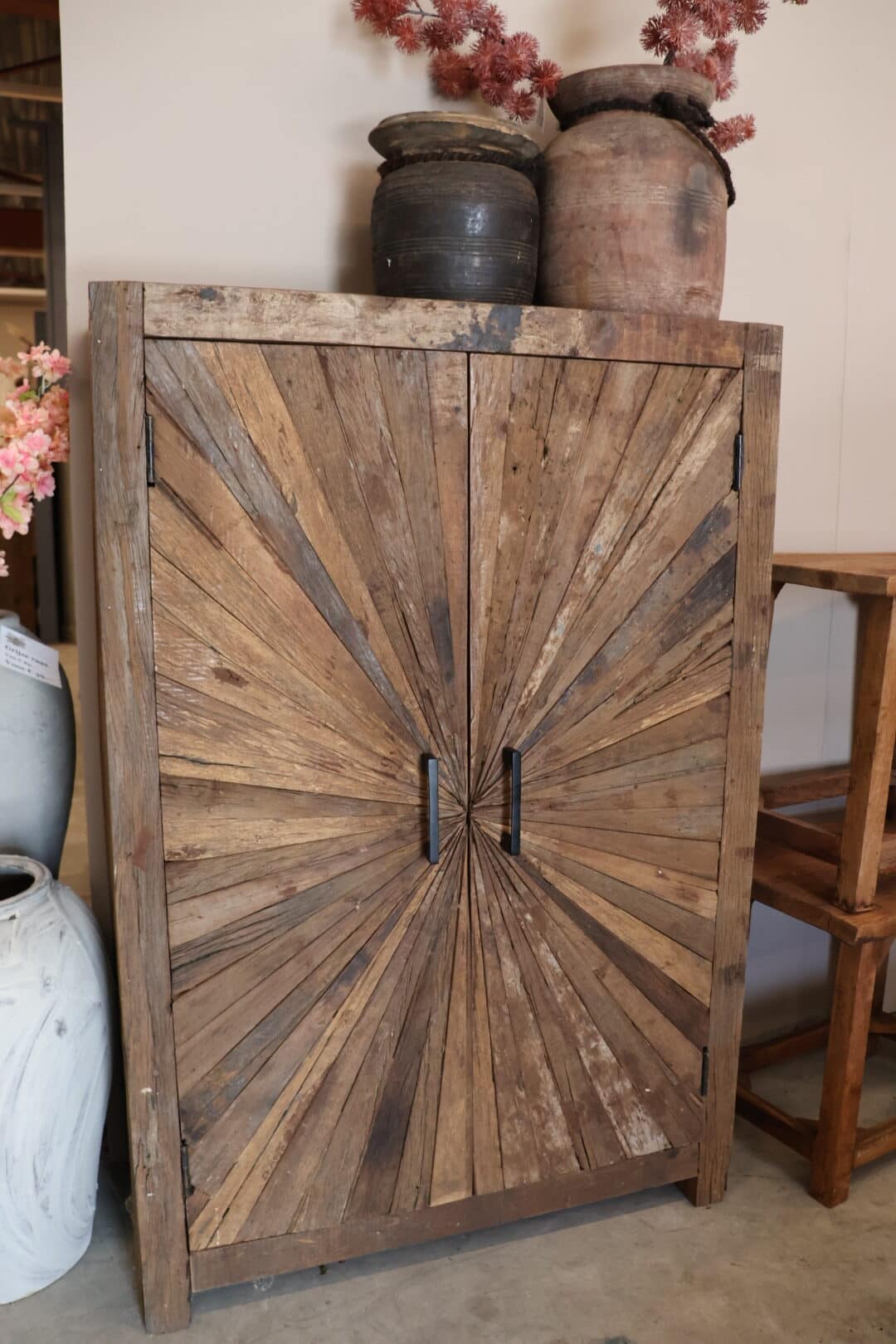 Deze smalle, hoge opbergkast van sleeper wood is een stoer meubelstuk dat weinig ruimte inneemt maar veel karakter toevoegt. Het unieke snijwerk in het deurtje maakt de kast bijzonder, terwijl het robuuste hout zorgt voor een stoere en doorleefde uitstraling.