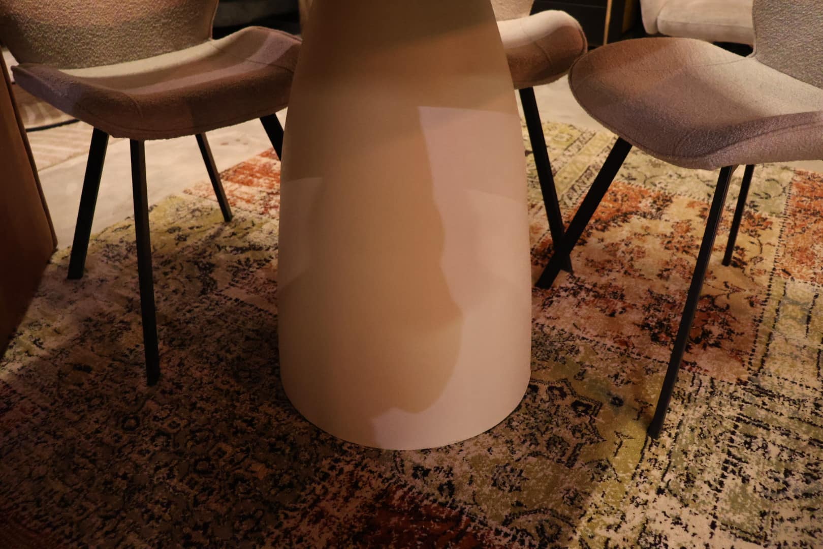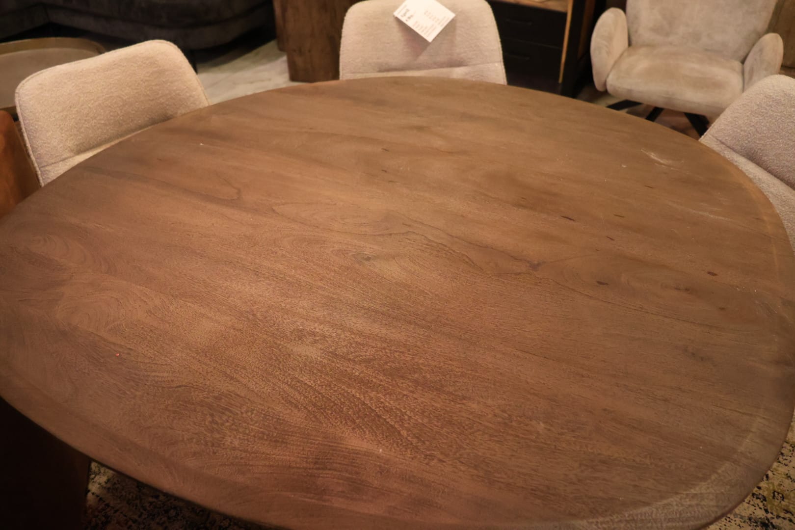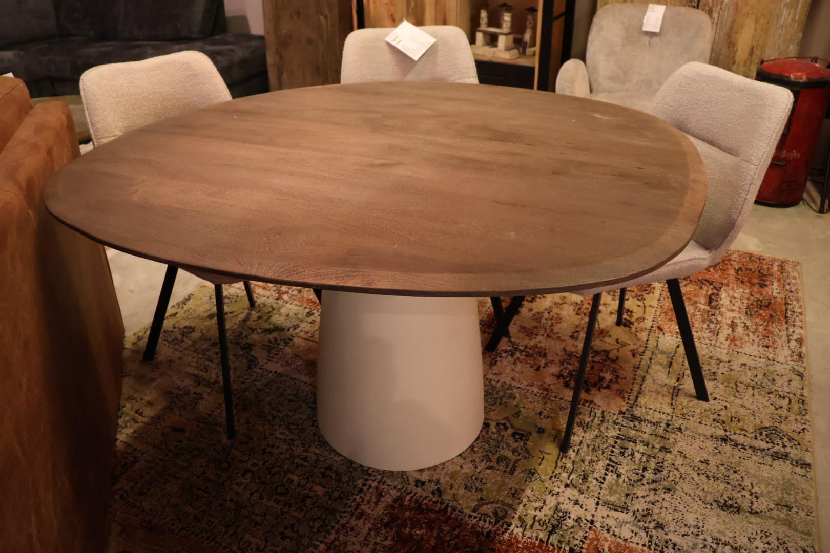 Deze massief mangohouten tafel combineert robuustheid met elegantie. Het dunne blad in een donkere kleur geeft de tafel een verfijnde uitstraling, terwijl de speelse, stevige poot een dynamisch en karaktervol element toevoegen.