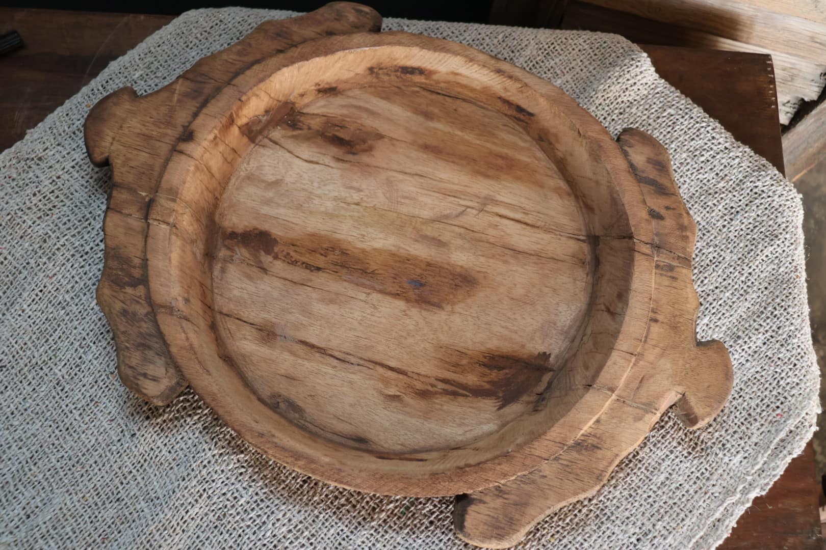 Oude, handgemaakte schaal uit India met een stoere en doorleefde uitstraling. Elk stuk is uniek en draagt de sporen van zijn verleden. Perfect als decoratief item in een landelijke interieur.