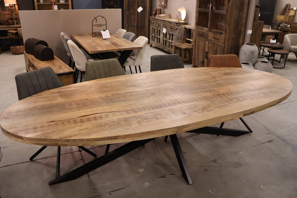 De tafel heeft een robuust blad en een mat zwarte metalen matrixpoot. Een ovale tafel geeft een gezellige speelse uitstraling aan je inrichting.