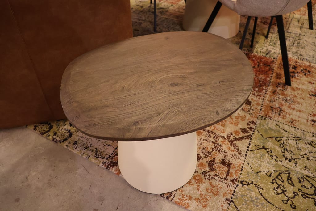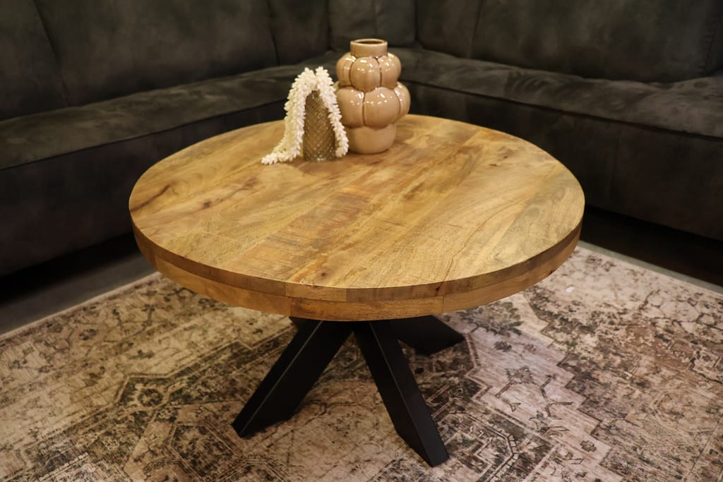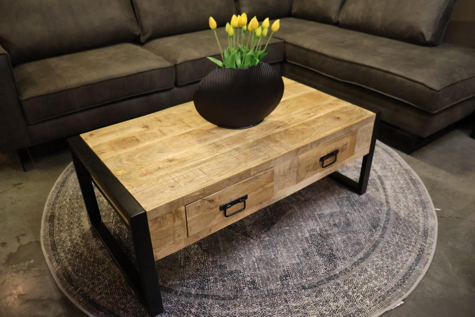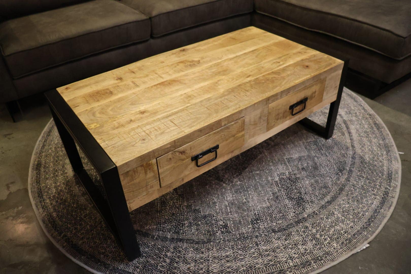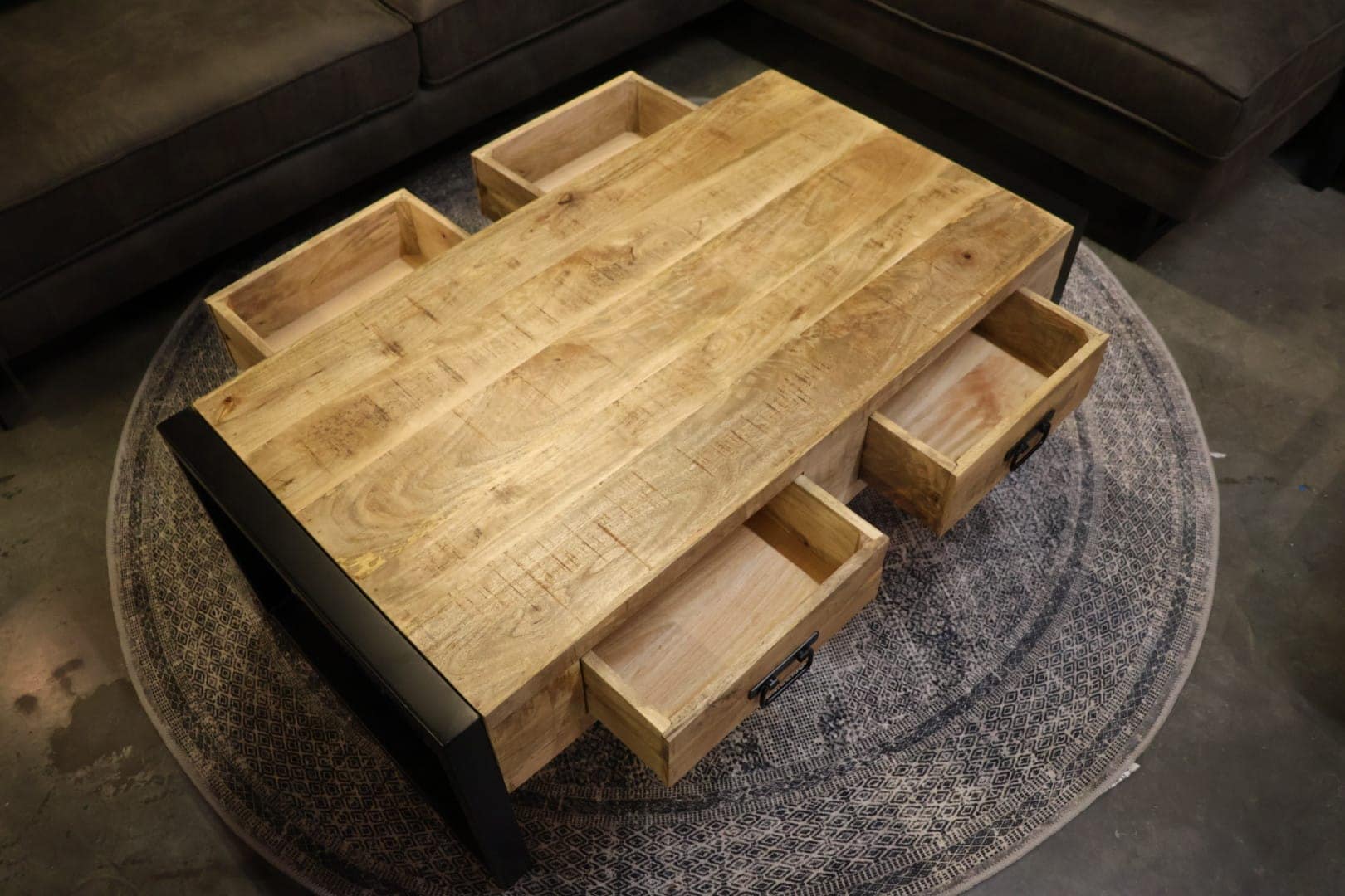 Salontafel met een metalen frame waartussen een mangohouten blad met 4 lades ligt. Stoer en industrieel.