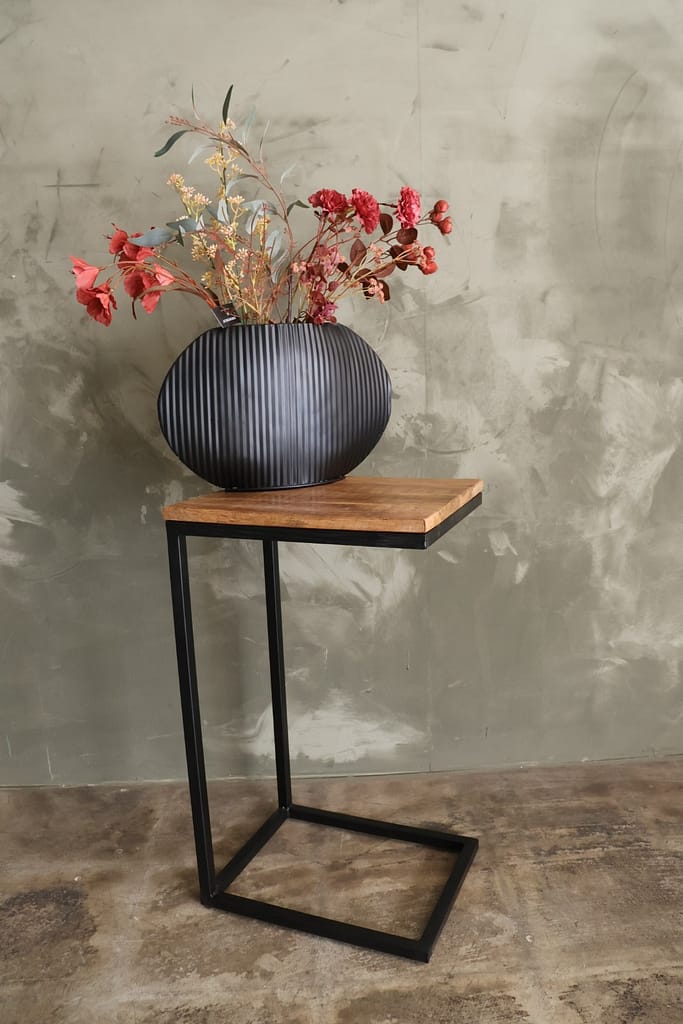 Salontafel met een metalen frame waartussen een mangohouten blad met 4 lades ligt. Stoer en industrieel.