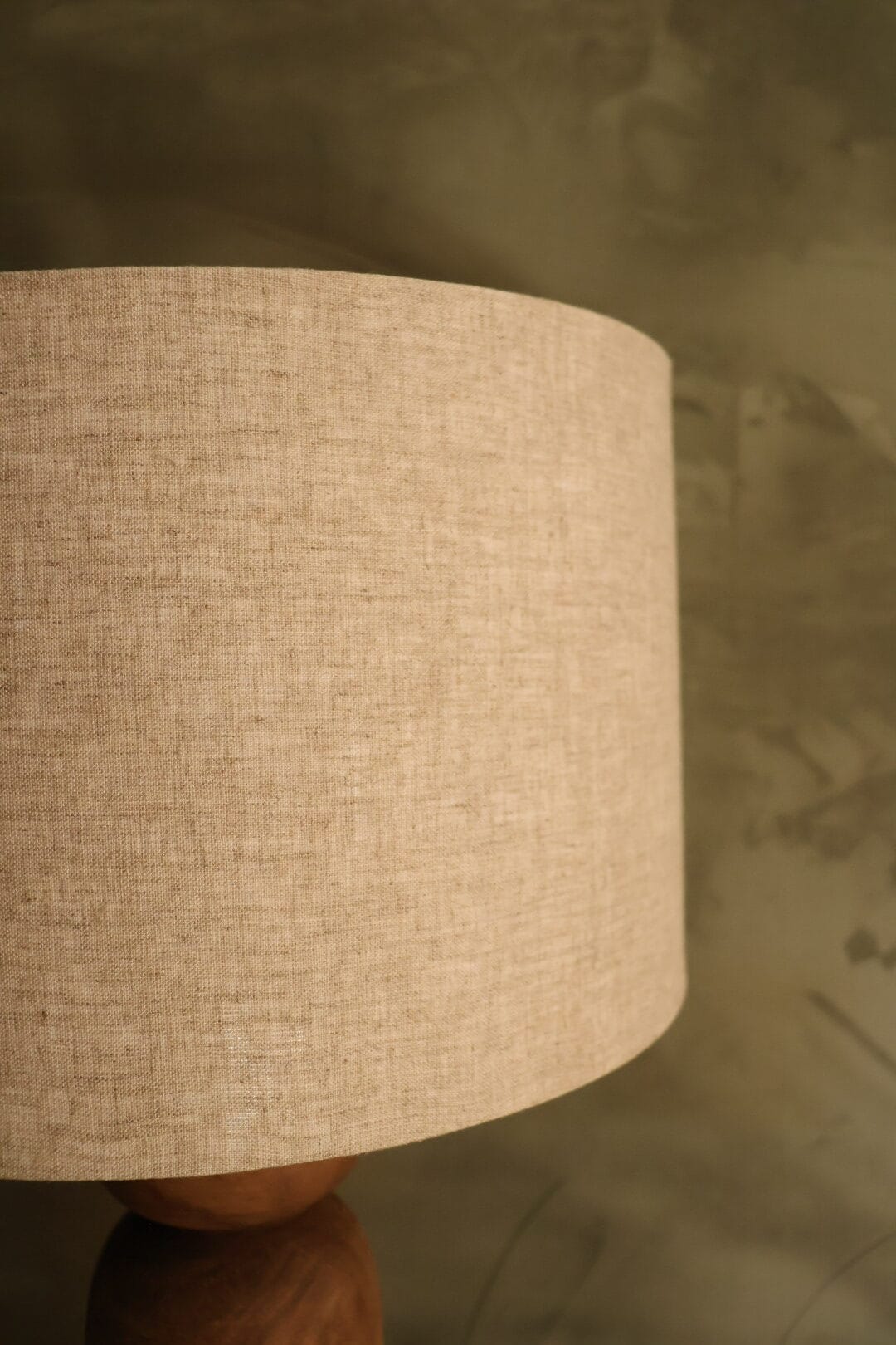 Deze tafellamp heeft een ronde houten ”balluster” voet met een mooi afgewerkte linnen kap.