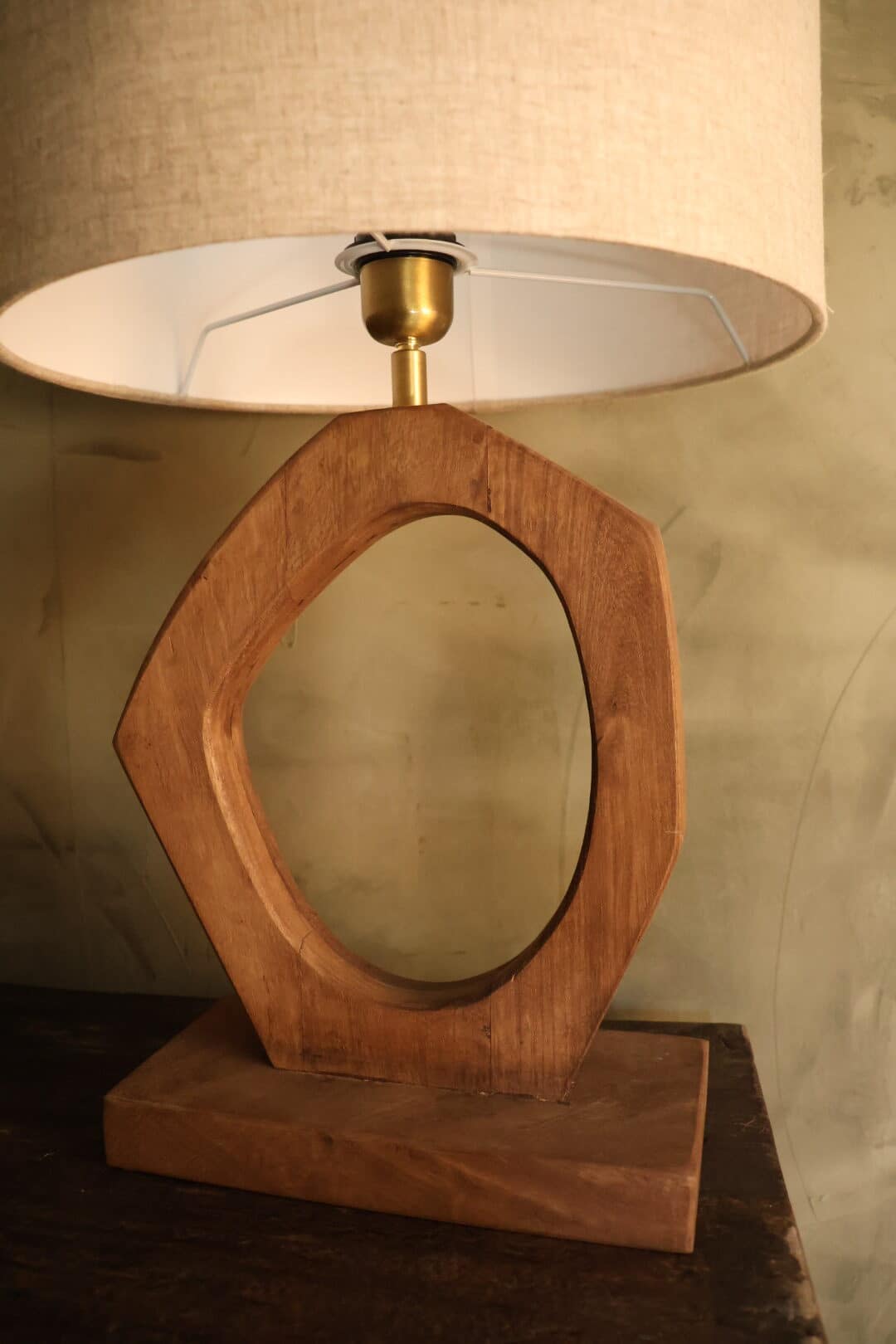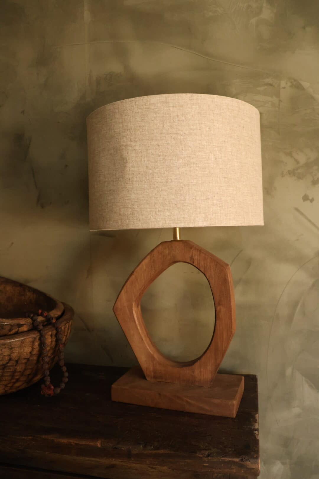 Deze houten tafellamp heeft een ”open” organische voet, dit in combinatie met de prachig afgewerkte linnen kap maken het een sfeervolle lamp.