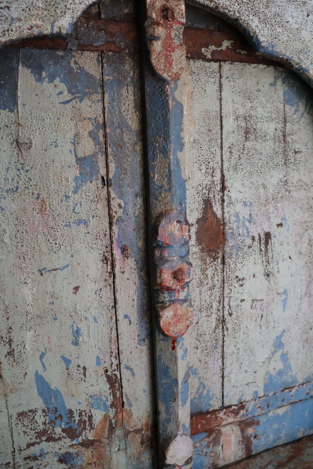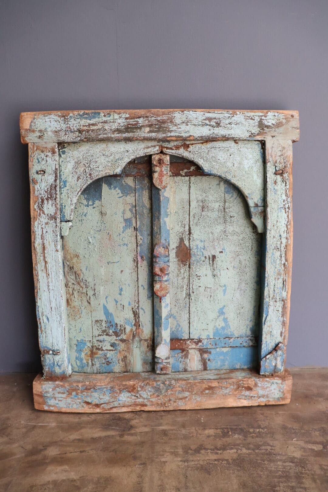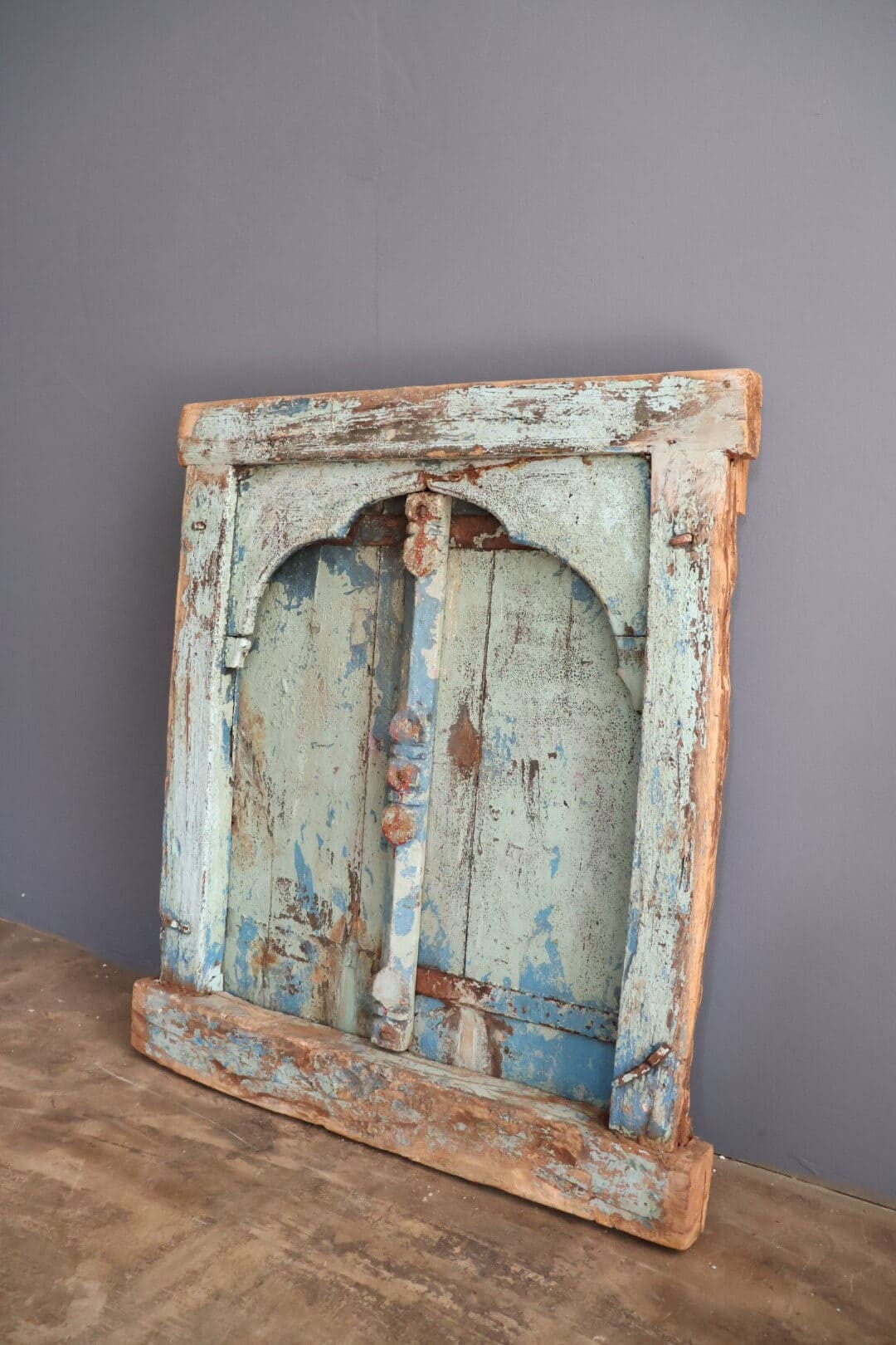 Voeg een unieke accent toe aan je interieur met deze authentieke vintage deuren uit India. De bijzondere blauwe tint maakt het een opvallende kunstwerk, perfect om boven een dressoir te plaatsten of als decoratief element aan de muur.