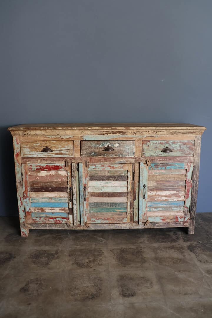 Breng een stukje Indiase charme in huis met dit vintage dressoir. De louvredeuren geven het meubel een luchtige en speelse uitstraling, terwijl de kleurrijke afwerking zorgt voor een uniek en opvallende accent in je interieur. Het dressoir biedt bovendien praktische opbergruimte voor al je spullen, van servies tot accessoires.