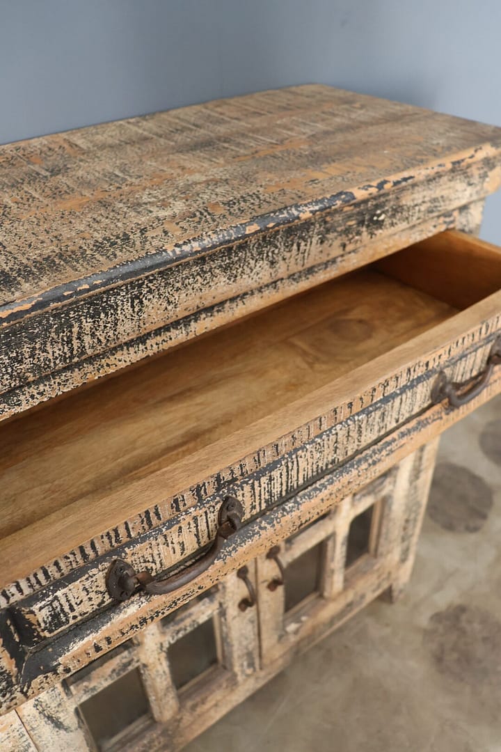Dit mooie dressoir uit India combineert functionaliteit met een stijlvolle uitstraling. Dankzij de glazen deurtjes kun je je mooiste accessoires, servies of decoratieve items tonen, terwijl de achterliggende opbergruimte zorgt dat alles netjes en georganiseerd blijft.