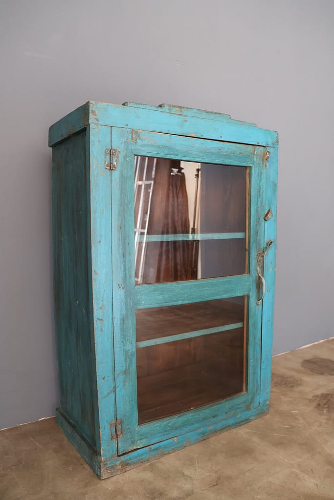 Deze vintage kapspiegel uit India is een uniek en karaktervol meubelstuk. De doorleefde blauwe kleur geeft de spiegel een warme, authentieke uitstraling, perfect voor een vintage of bohemien interieur.