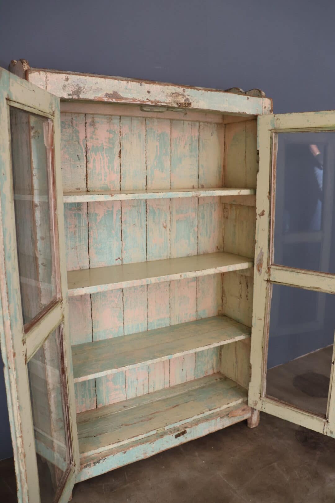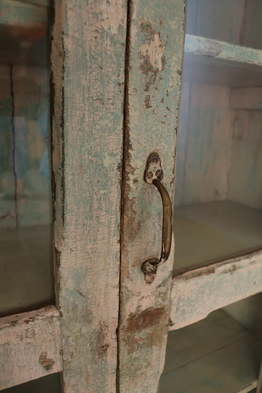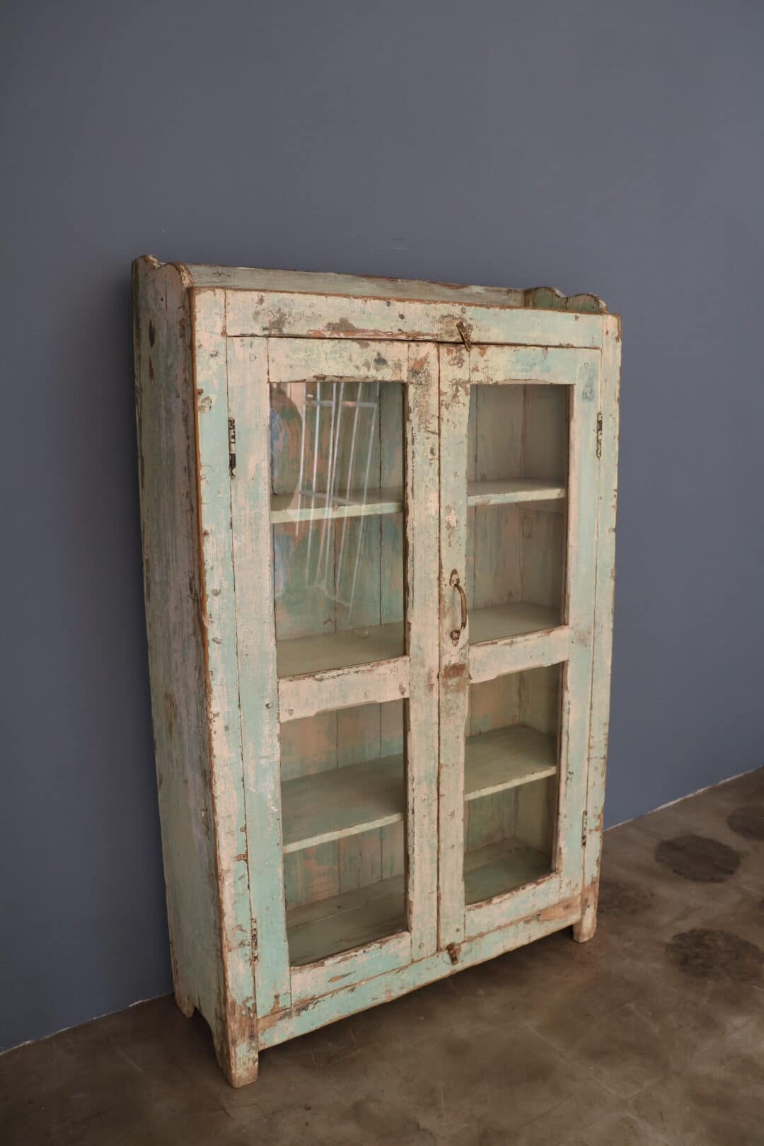 Dit leuke, klein kastje uit India is een charmant vintage meubelstuk met een brocante kleur en authentieke uitstraling. De glazen deurtjes maken het perfect om je mooiste servies, decoratie of souvenirs stijlvol te presenteren.