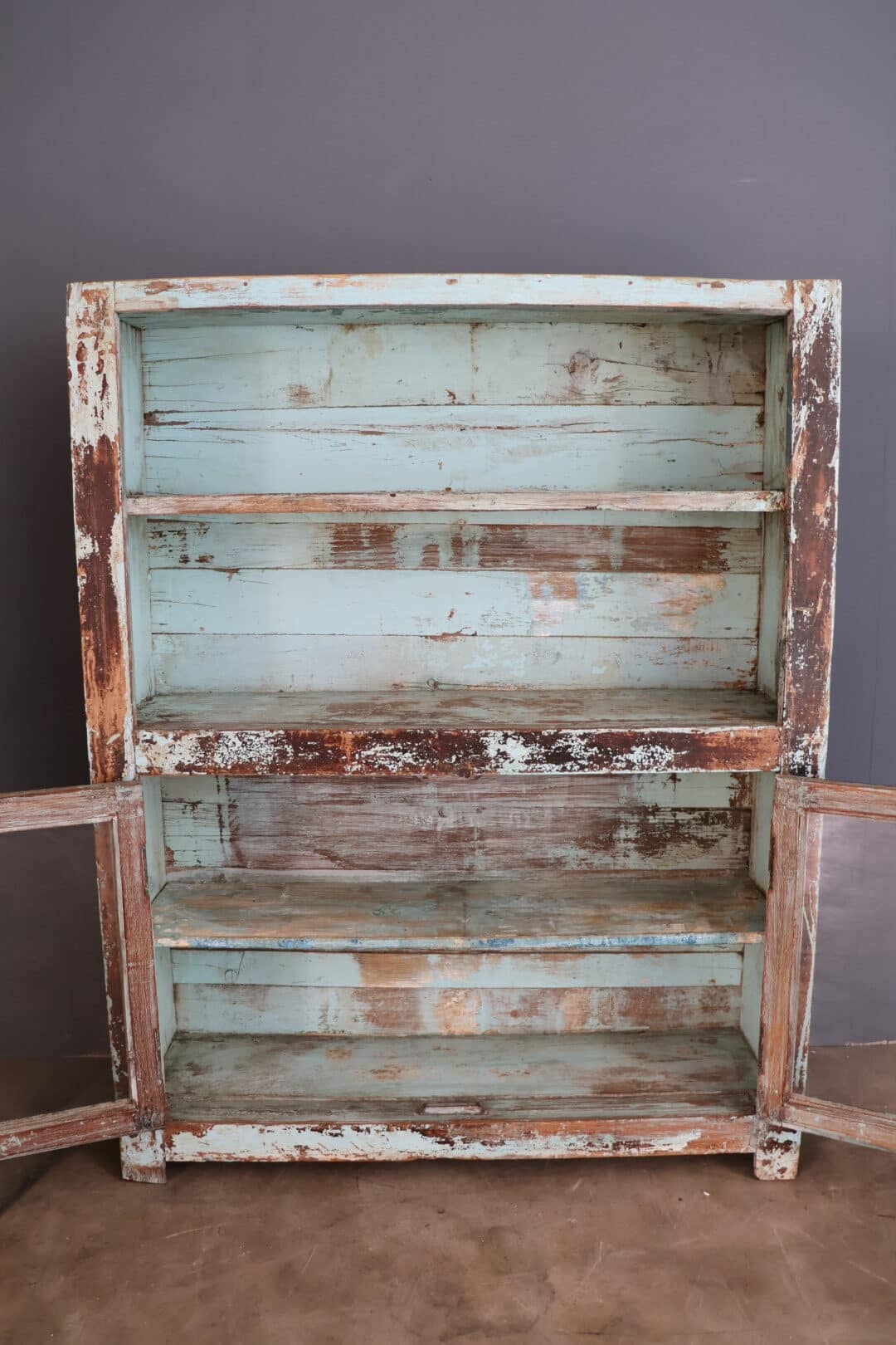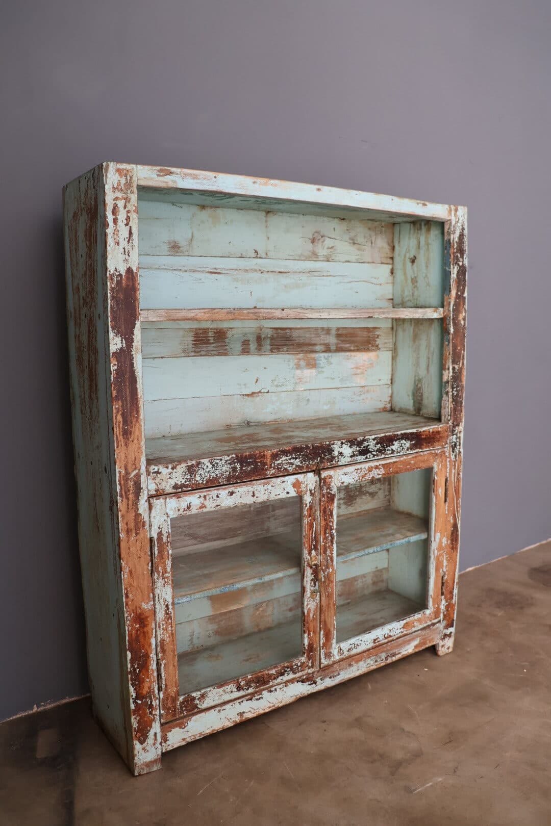 Deze leuke vintage kast uit India is een echte eyecatcher. De verouderde blauwe kleur geeft het meubel een doorleefde, authentieke uitstraling die perfect past bij een sfeervol interieur.