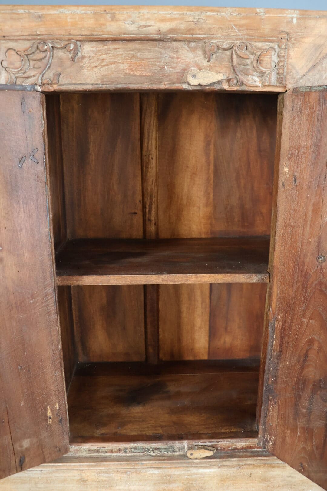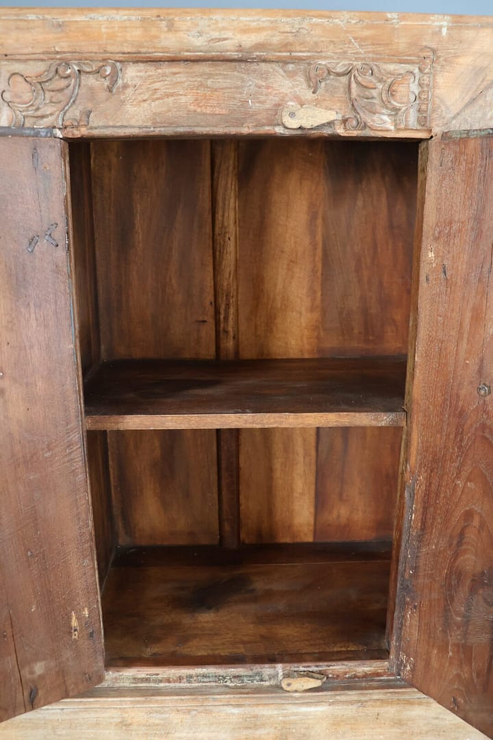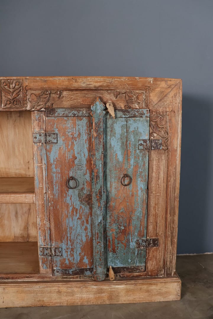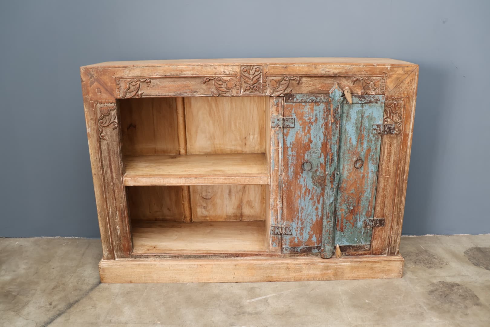 Dit kastje uit India is zowel praktisch als stijlvol. Het biedt voldoende ruimte voor je tv, mediabenodigdheden of andere spullen, terwijl het blauwe deurtje een speelse en uniek detail toevoegt aan het ontwerp. Het handgemaakte vakmanschap en de subtiele kleuren zorgen voor een warme een authentieke uitstraling in je interieur.