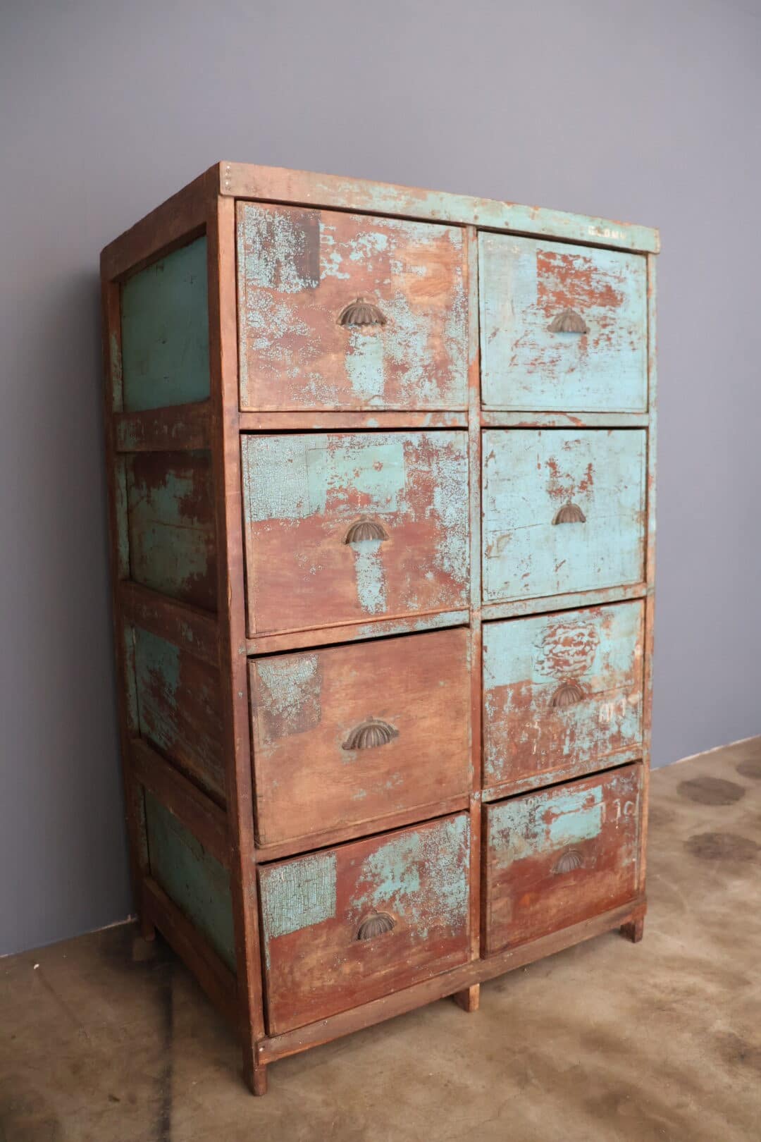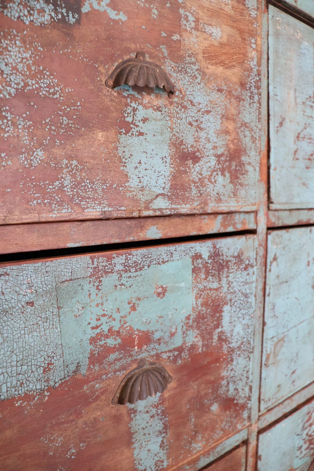 Deze mooie vintage ladekast combineert stijl met functionaliteit. Uitgevoerd in een karaktervolle diepe blauwe kleur, straalt de kast warmte en authenticiteit uit. De praktische vakken en de diepe laden zorgen voor meer dan genoeg opbergruimte, waardoor dit meubelstuk niet alleen prachtig is om te zien, maar ook ontzettend handig in gebruik.