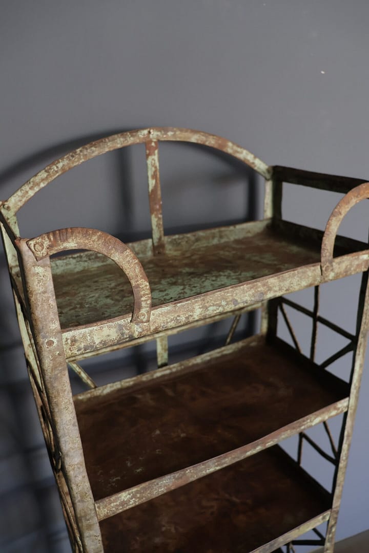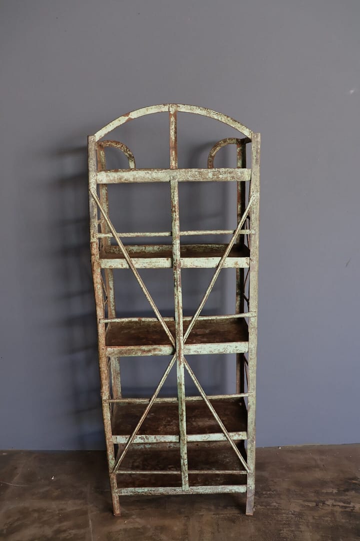 Dit vintage rek van metaal in een groene kleur is een echte eyecatcher. Dankzij het smalle ontwerp past het moeiteloos in iedere ruimte, van hal tot woonkamer of kantoor. het rek combineert praktische opbergruimte met een unieke vintage uitstraling, waardoor het zowel functioneel als decoratief is.