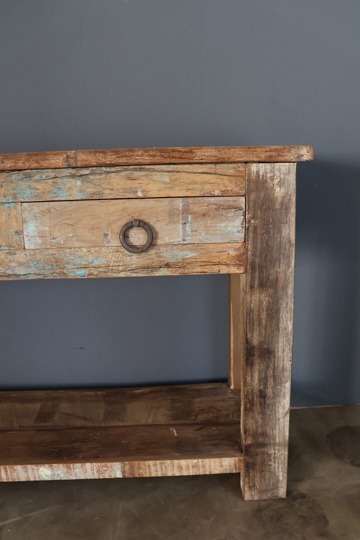 Deze grote side table combineert een rustige uitstraling met karaktervolle details. Het ruimte tafelblad biedt voldoende plek om spullen op te zetten, maar behoudt een minimalistische, serene look, zodat het nooit druk oogt. De grote, opvallende ringgrepen geven het meubel een stoer accent en trekken subtiel de aandacht zonder te overheersen.