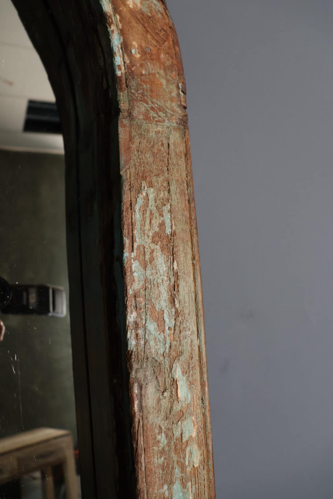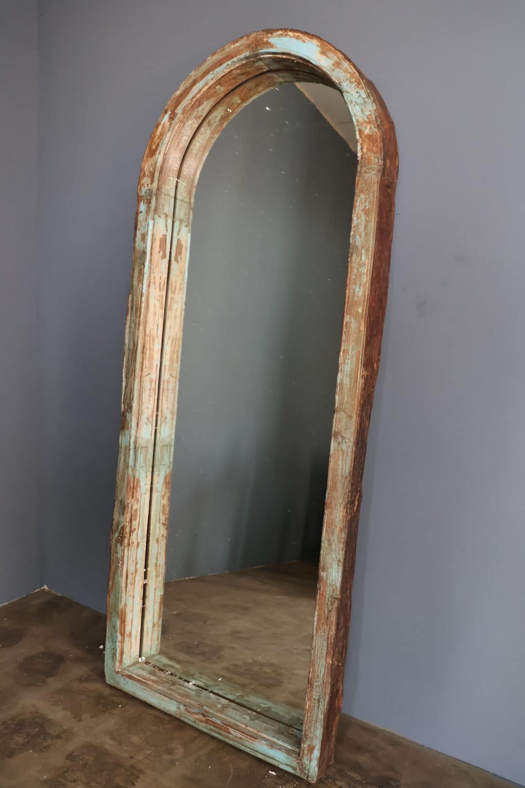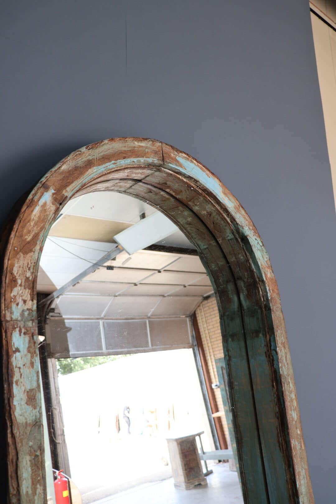 Deze unieke vintage spiegel valt op door zijn bijzondere vorm met een ronde bovenkant en een frame in een verouderde blauwe kleur. Het verweerde hout geeft de spiegel een authentieke uitstraling, alsof hij al een verhaal met zich meedraagt.