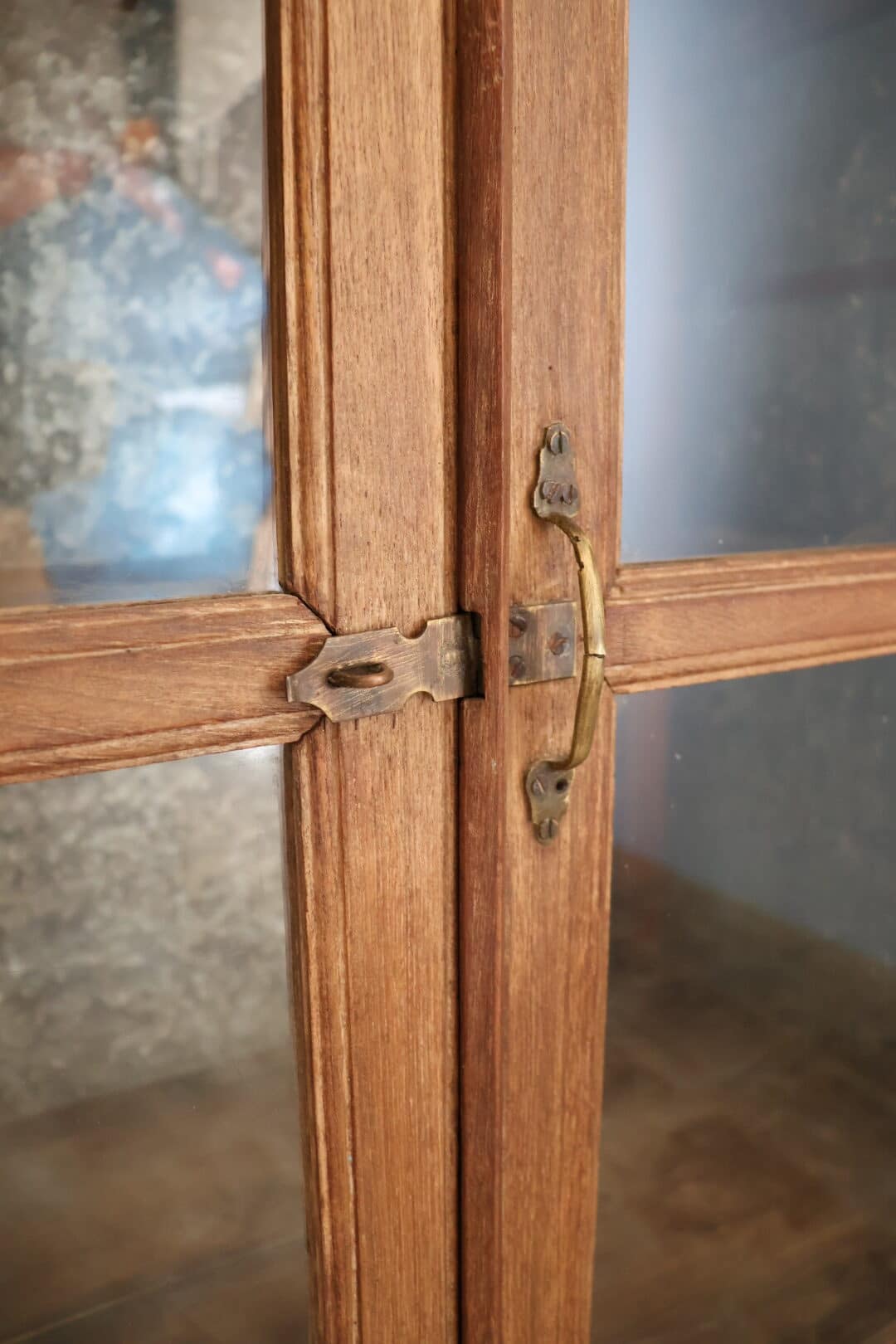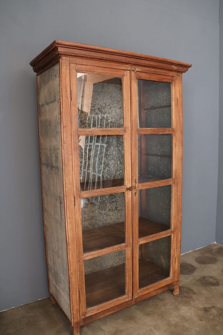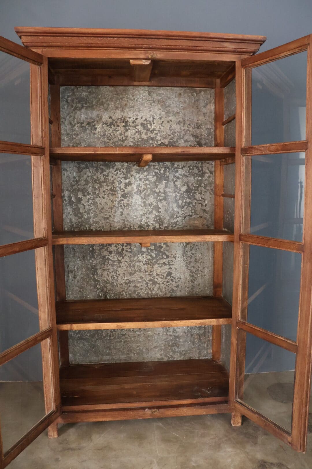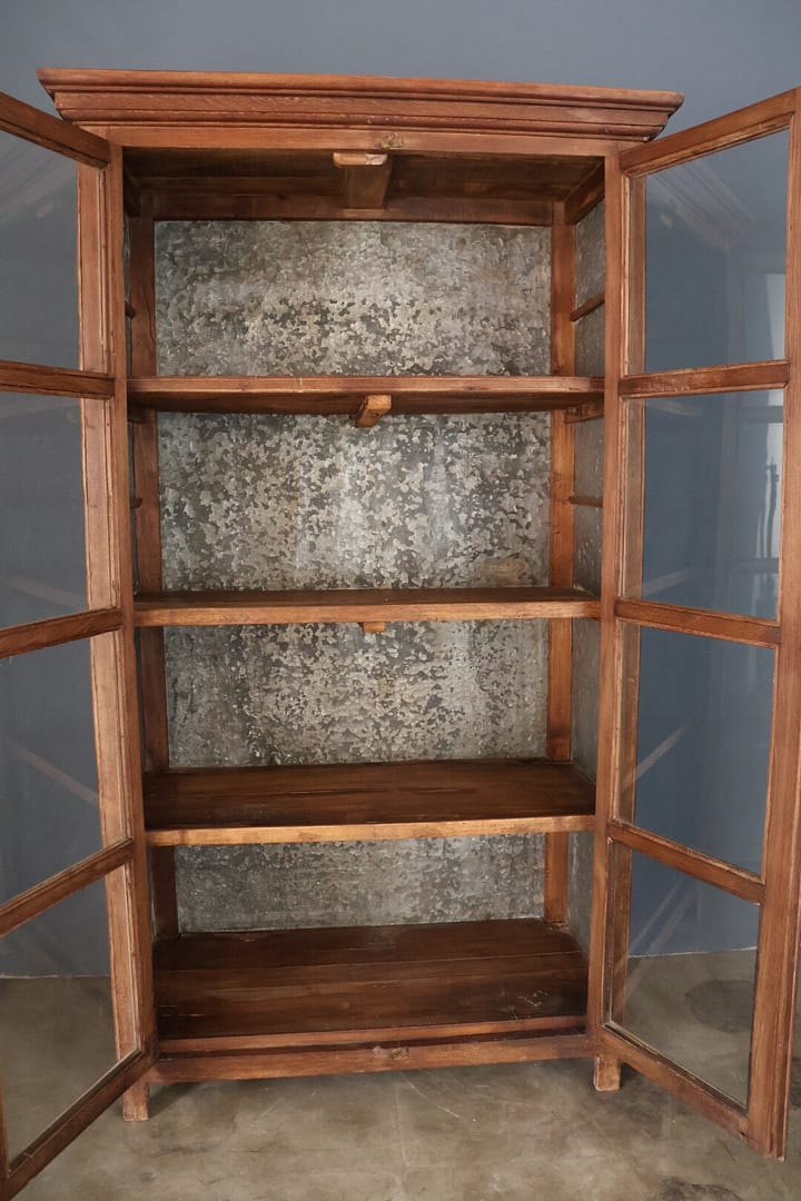 Deze vitrinekast is een echte blikvanger voor liefhebbers van vintage en industrieel design. Het warme, oud bruine hout krijgt extra karakter door de unieke afwerking van het metalen achter paneel – een stoer detail dat het geheel een eigenzinnige geeft.
