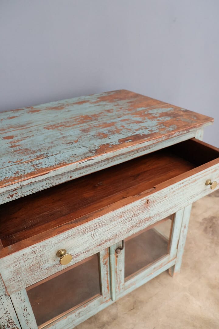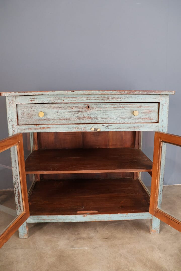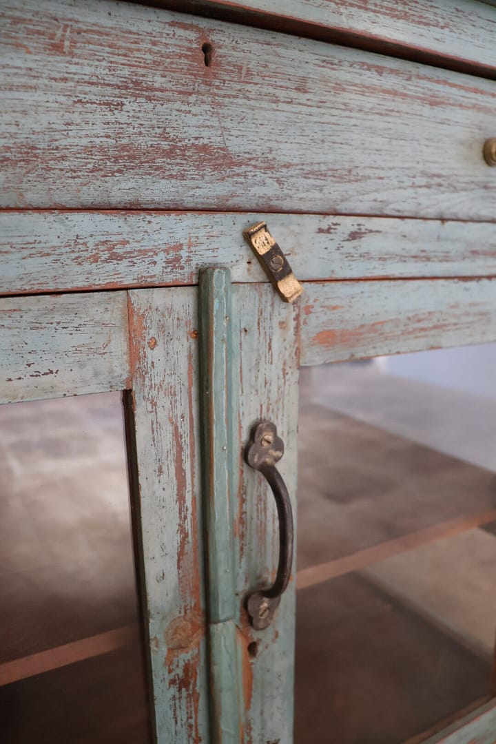Dit charmante lage vitrinekastje heeft een prachtige oudblauwe kleur die subtiel aanwezig is: het valt niet te veel op, maar trekt toch op een elegante manier de aandacht. De gouden knopjes geven het meubel een verfijnd detail en een vleugje luxe.