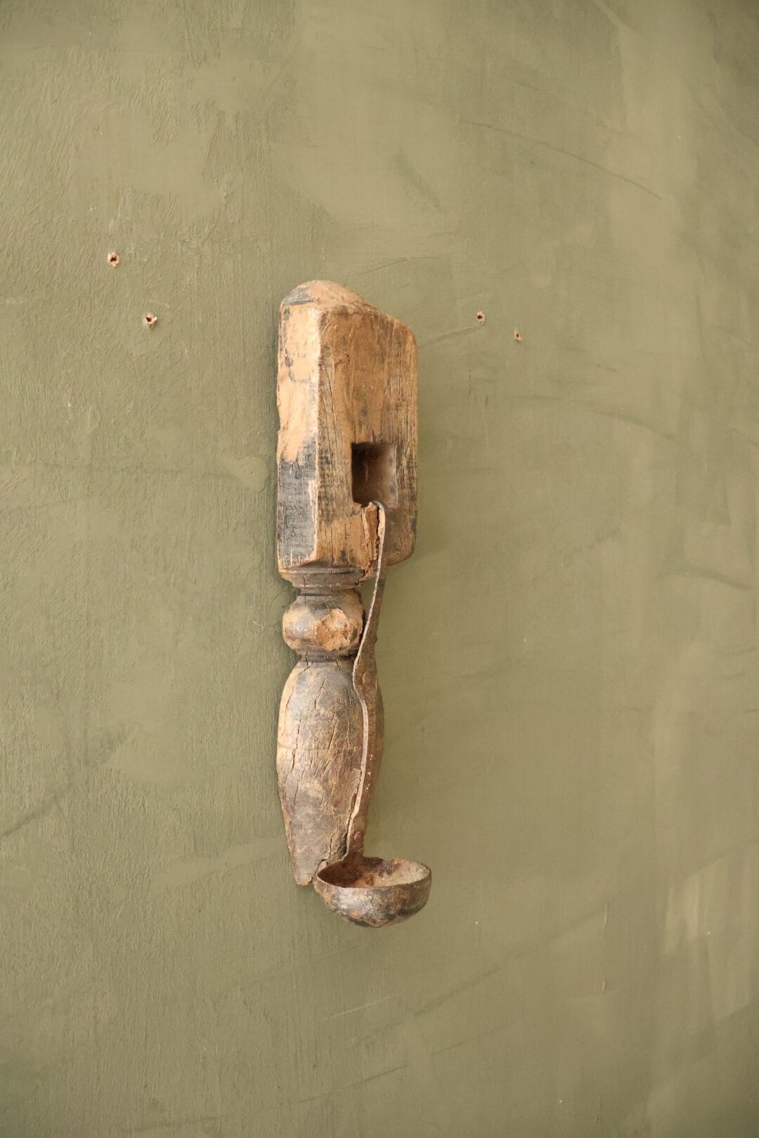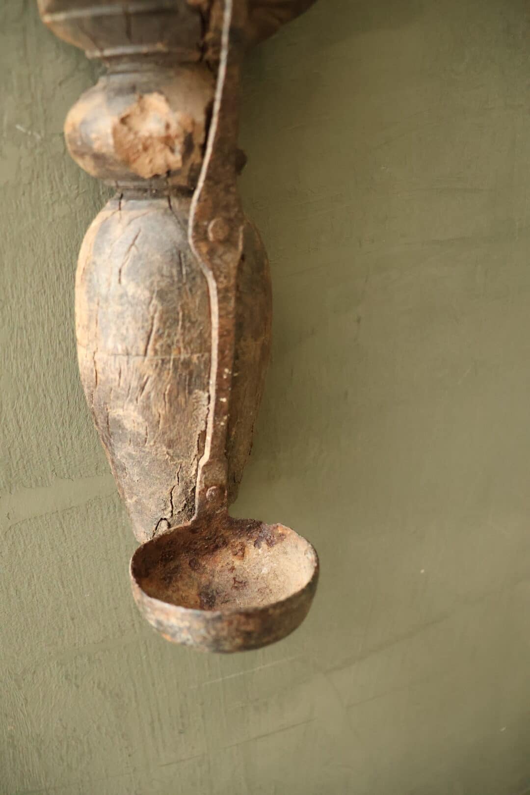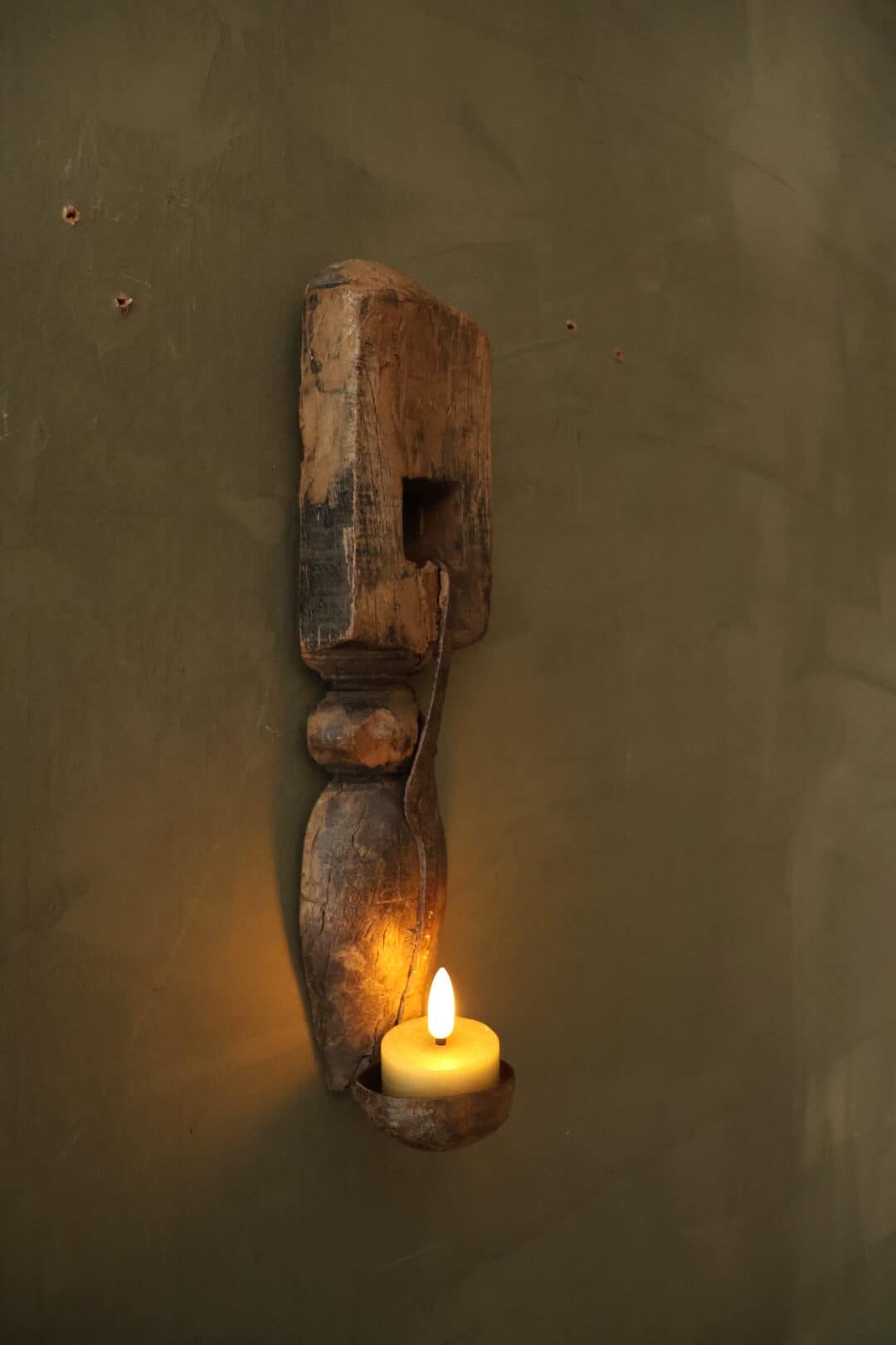 Stoere vintage houten wandkandelaar met vintage lepel waar je een waxinelichtje in kan laten branden.