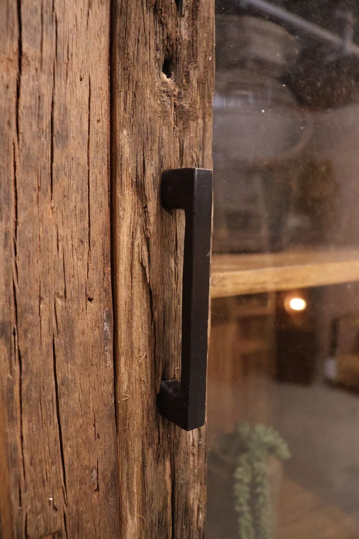 Deze smalle vitrinekast van sleepwood hout combineert stoere robuustheid met een elegant design. Dankzij het compacte formaat past hij perfect in kleinere ruimtes, terwijl het natuurlijke hout en de stevige afwerking voor een krachtige uitstraling zorgen. Ideaal om je mooiste items stijlvol tentoon te stellen.