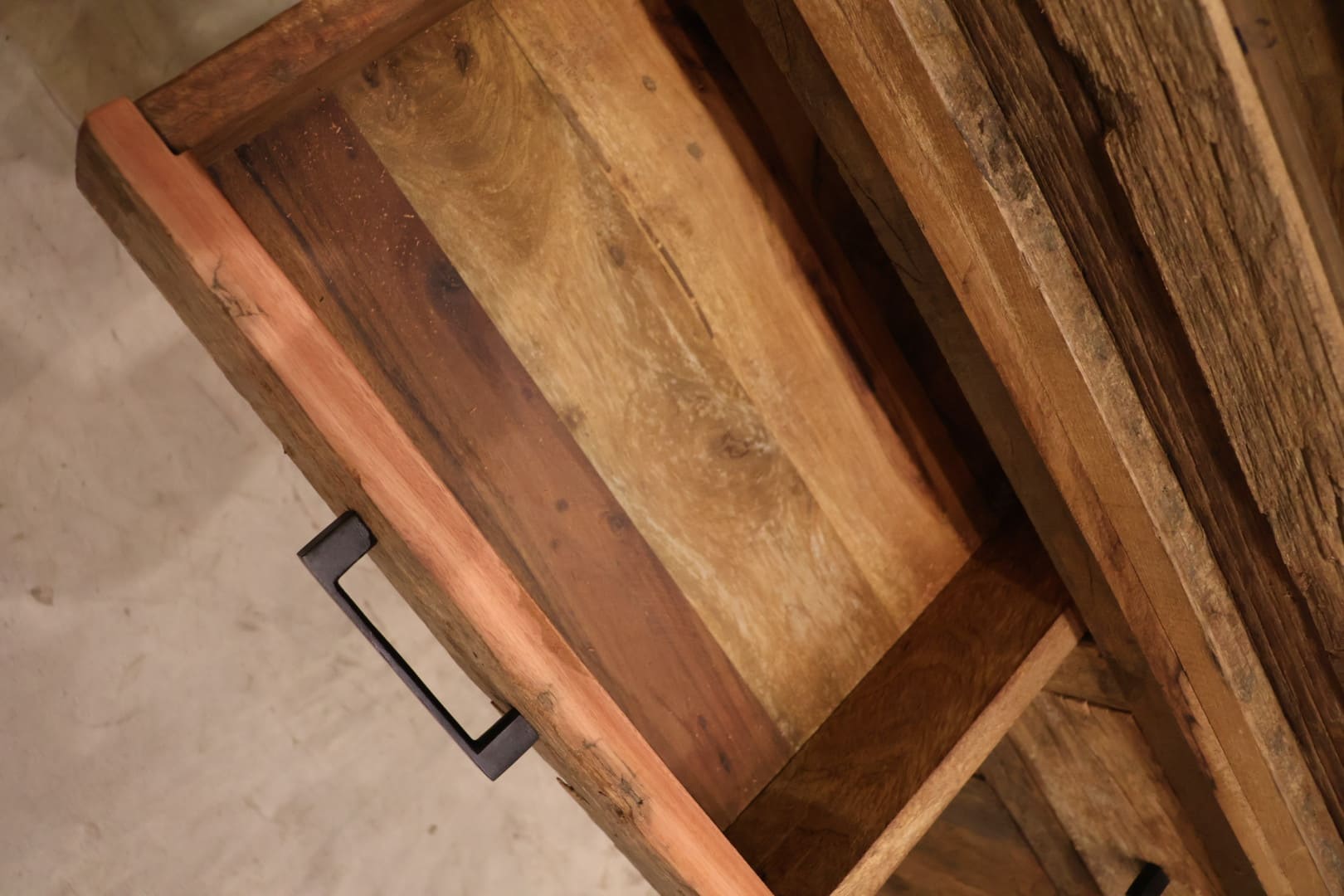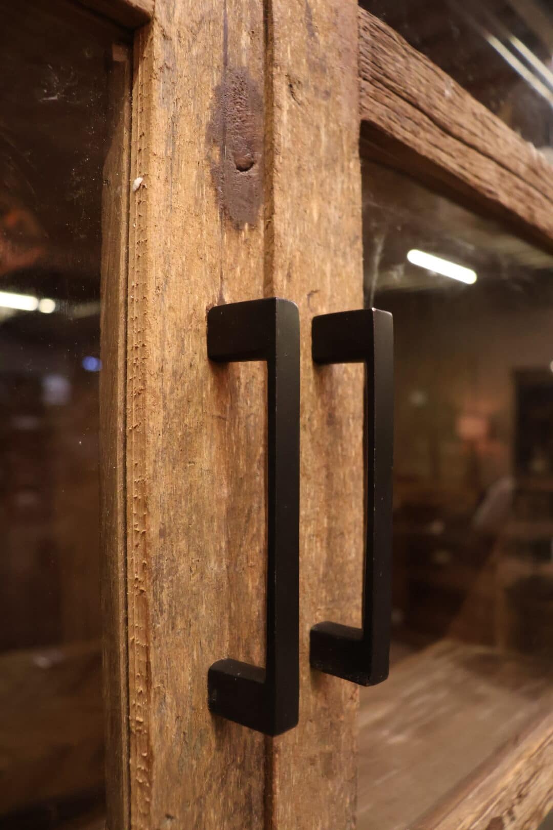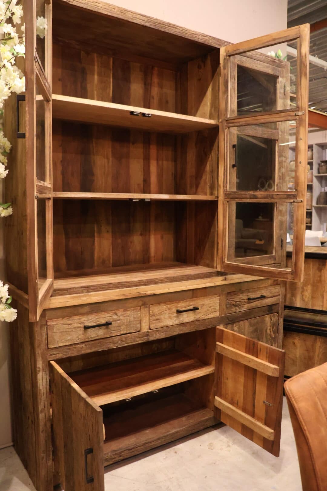 Deze robuuste vitrinekast van sleeperwood combineert karakter, functionaliteit en een stoere uitstraling. De kast is voorzien van glazen deurtjes aan de bovenzijde, ideaal om je mooiste accessoires, servies of decoratie stijlvol te presenteren.