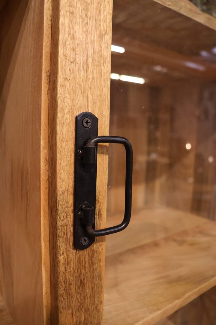 Deze grote vitrinekast van massief mangohout straalt warmte en authenticiteit uit. Het robuuste hout maakt de kast stevig en duurzaam, terwijl het ruime formaat ideaal is om servies, boeken of decoratieve items stijlvol tentoon te stellen.