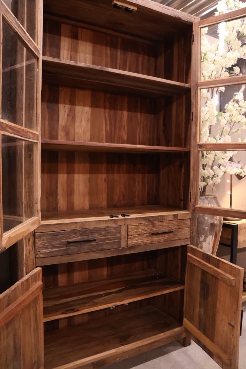 Deze prachige vitrinekast is afkomstig uit India en is daar met de hand gemaakt. Het doorleefde hout zorgt voor een unieke uitsraling.